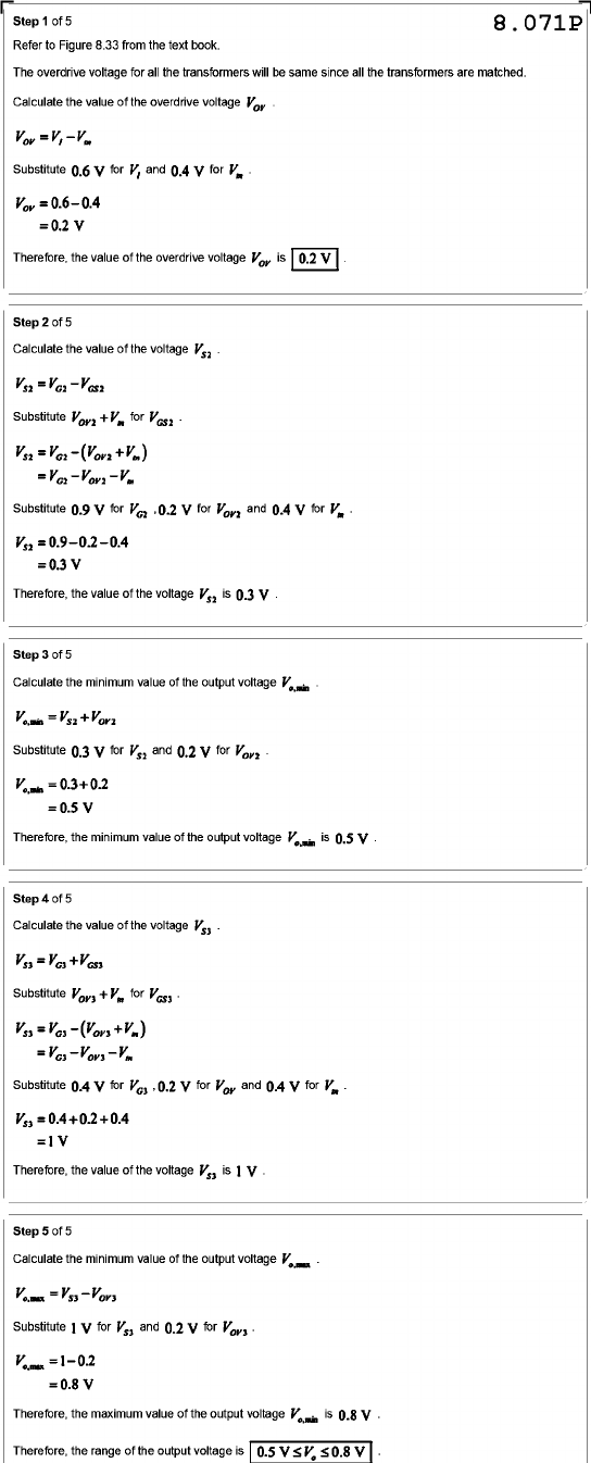 Step 1 of 5 8.071P Refer to Figure 8.33 from the text book. The overdrive voltage for all the transformers will be same since all the transformers are matched. Calculate the value of the overdrive voltage Substitute 0.6 V for and 0.4 V for = 0.2 V Therefore, the value of the overdrive voltage is 0.2 V Step 2 of 5 Calculate the value of the voltage Substitute for Substitute 0.9 V for 0.2 V for and 0.4 V for = 0.3 V Therefore, the value of the voltage Vₛ₂ is 0.3 V Step 3 of 5 Calculate the minimum value of the output voltage Substitute 0.3 V for Vₛ₂ and 0.2 V for = 0.3+0.2 =0.5 V Therefore, the minimum value of the output voltage is Step 4 of 5 Calculate the value of the voltage Substitute for Substitute 0.4 V for 0.2 V for and 0.4 V for = V Therefore, the value of the voltage Vₛ₃ is Step 5 of 5 Calculate the minimum value of the output voltage Substitute 1 V for Vₛ₃ and 0.2 V for Therefore, the maximum value of the output voltage is Therefore, the range of the output voltage is