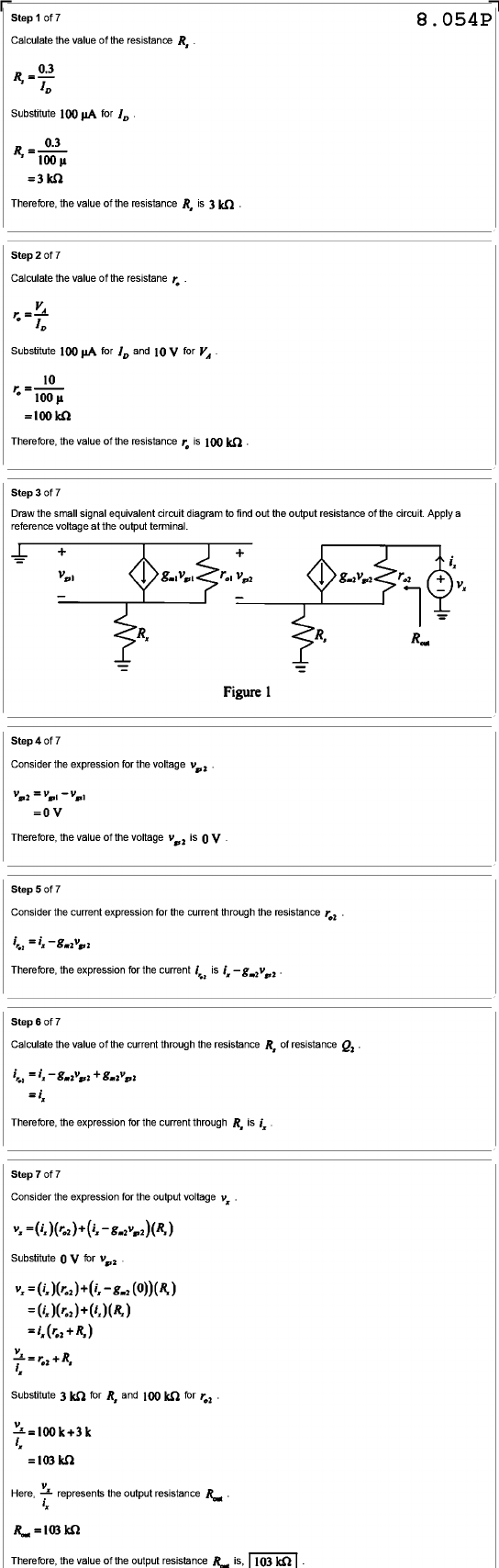 Step of 7 8.054P Calculate the value of the resistance R, R, 0.3 Substitute 100 for 0.3 R, = 100 = kΩ Therefore, the value of the resistance R, is 3 Step of 7 Calculate the value of the resistane Substitute 100 for and 10 V for 10 100 µ = 100 kΩ Therefore, the value of the resistance is Step of 7 Draw the small signal equivalent circuit diagram to find out the output resistance of the circuit. Apply a reference voltage at the output terminal. + + i, + - - R, Figure 1 Step of 7 Consider the expression for the voltage = = V Therefore, the value of the voltage is Step of 7 Consider the current expression for the current through the resistance Therefore, the expression for the current is Step of 7 Calculate the value of the current through the resistance R, of resistance =i, Therefore, the expression for the current through R, is i, Step of 7 Consider the expression for the output voltage Substitute Substitute 3 kΩ for R, and 100 kΩ for i, = 103 kΩ Here, represents the output resistance Therefore, the value of the output resistance is,