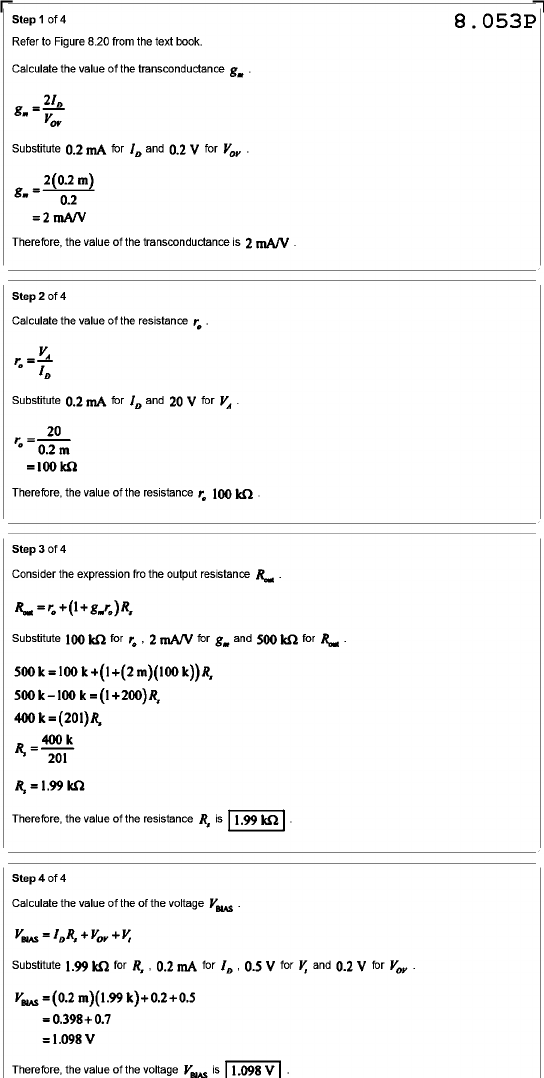 Step 1 of 4 8.053P Refer to Figure 8.20 from the text book. Calculate the value of the transconductance 8m Substitute 0.2 mA for and 0.2 V for 0.2 = 2 mA/V Therefore, the value of the transconductance is 2 mA/V Step 2 of 4 Calculate the value of the resistance = Substitute 0.2 mA for and 20 V for = 0.2 m 20 = 100 kΩ Therefore, the value of the resistance r. 100 kΩ Step 3 of 4 Consider the expression fro the output resistance Substitute 100 kΩ for 2 mA/V for 8m and 500 kΩ for R, = 1.99 kΩ Therefore, the value of the resistance R, is Step 4 of 4 Calculate the value of the of the voltage Substitute 1.99 kΩ for R, 0.2 mA for 0.5 V for and 0.2 V for =0.398+0.7 = 1.098 V Therefore, the value of the voltage VBIAS is 1.098 V