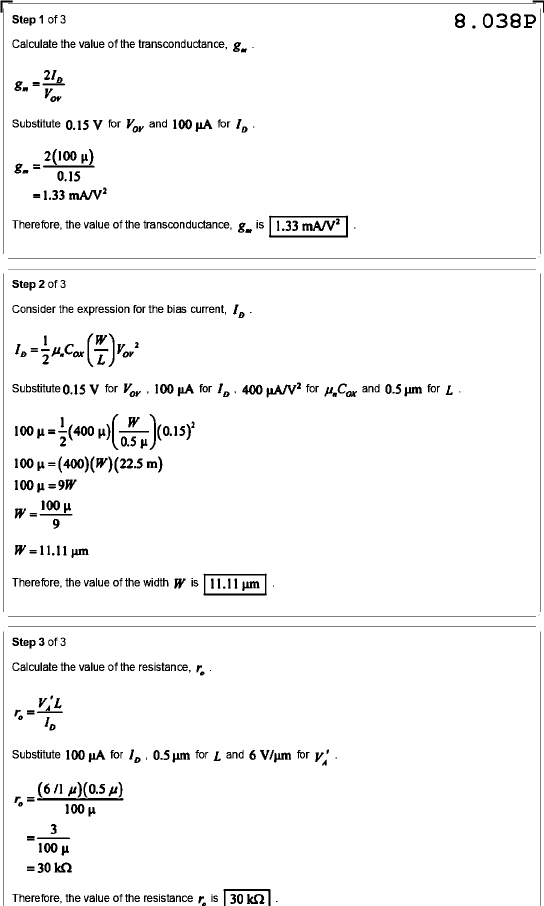 Step 1 of 3 8.038P Calculate the value of the transconductance, Substitute 0.15 V for and 100 for 0.15 =1.33 mA/V² Therefore, the value of the transconductance, 8m is 1.33 mA/V² Step 2 of 3 Consider the expression for the bias current, Substitute 0.15 V for , 100 for 400 for and 0.5 µm for Therefore, the value of the width W is 11.11 µm Step 3 of 3 Calculate the value of the resistance, r. Substitute 100 µA for 0.5 µm for L and 6 V/µm for 100 = 100 = 30 kΩ Therefore, the value of the resistance is 30 kΩ