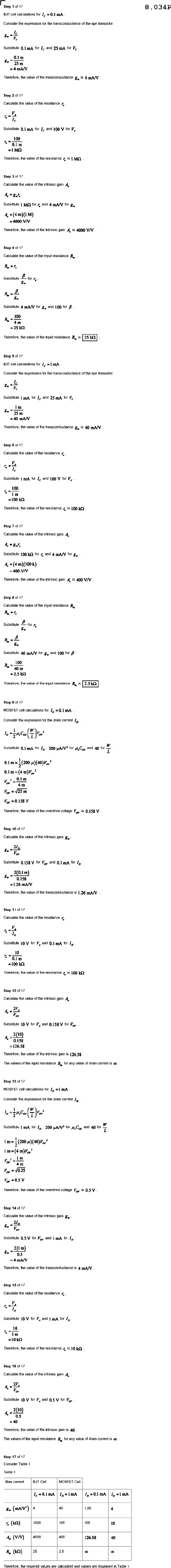 8.034P 0.1m Therefore Substitute 100 MO Substitute Therefore Substitute 25 m mA 100 Therefore Substitute Consider Substitute Step 10 of 17 Substitute 0.158 Step 11 of 17 Substitute Step 12 of 17 Substitute 0.158 2(10) 0.158 =126.58 Therefore value 126.58 MOSFET Substitute =4 mA/V mA/V Step 15 of 17 Substitute Step 18 of 17 Step 17 of 17 Consider Table-1 Table-1 1.26 4 1000 100 100 10 4000 400 126.58 40 25 25