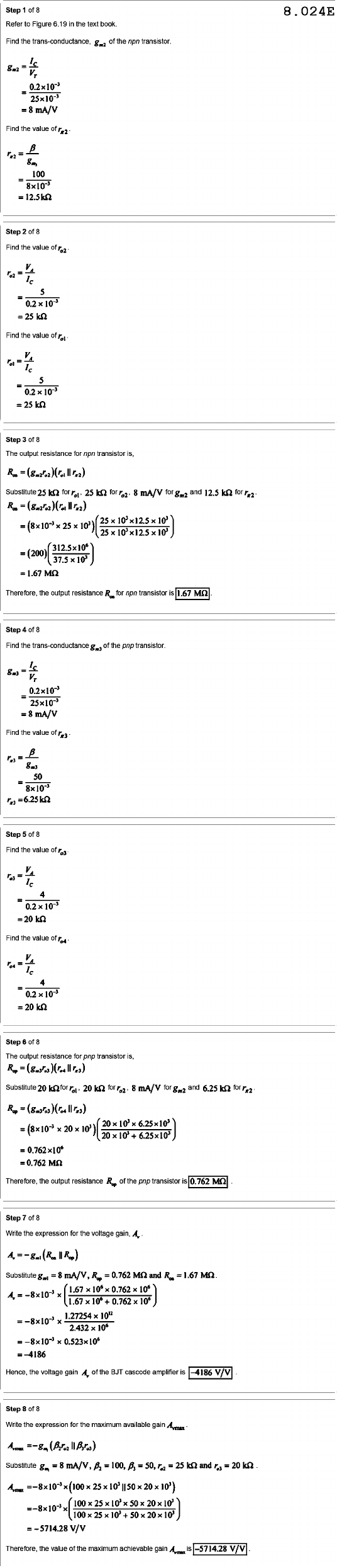 Step of 8 8.024E Refer to Figure 6. 19 in the text Find the trans-conductance, 8m2 of the npn transistor. 0.2x10⁻³ 8 mA/V Find the value 100 = Step of 8 Find the value 5 = Find the value 5 = Step of 8 The output resistance for npn transistor is, Substitute 25 25 8 mA/V for and 12.5 312.5x10 = (200) Therefore, the output resistance for npn transistor is Step 8 Find the of the pnp transistor. 8m3 0.2x10⁻³ 8 mA/V Find the value 8m3 50 = =6.25kQ Step Find the value 4 = Find the value 4 = Step of 8 The output resistance for pnp transistor is, Substitute 20 8 mA/V for 8m2 and 20 0.762 Therefore, the output resistance of the pnp transistor is 762 Step of 8 Write the expression for the voltage gain, 2.432 Hence, the voltage gain of the BJT cascode amplifier is -4186 V/V -4186 Step of 8 Write the expression for the maximum available gain Substitute = = = and = Therefore, the value of the maximum achievable gain is -5714.28 V/V