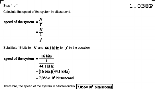 Step 1 of 1 1.038P Calculate the speed of the system in bits/second. speed of the system = = N N f T Substitute 16 bits for N and 44.1 kHz for f in the equation. 16 bits speed of the system = 1 44.1 kHz =7.056x10⁵ bits/second Therefore, the speed of the system in bits/second is 7.056x10⁵ bits/second