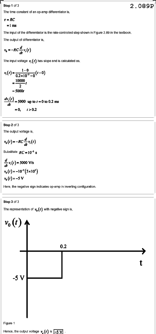 Step 1 of 3 2.089P The time constant of an op-amp differentiator is, = RC = ms The input of the differentiator is the rate-controlled step shown in Figure 2.89 in the textbook. The output of differentiator is, The input voltage has slope and is calculated as, up to = to 0.2 ms =0, 1>0.2 Step 2 of 3 The output voltage is, Substitute Here, the negative sign indicates op-amp in inverting configuration. Step 3 of 3 The representation of with negative sign is, (t) 0.2 t -5 V Figure 1 Hence, the output voltage is