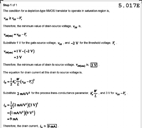 Step 1 of 1 5.017E The condition for a depletion-type NMOS transistor to operate in saturation region is, Therefore, the minimum value of drain-source voltage, is, Substitute 1 V for the gate-source voltage, , and for the threshold voltage, =3V Therefore, the minimum value of drain to source voltage, is, 3V The equation for drain current at this drain to source voltage is, Substitute 2 for the process trans-conductance parameter, , and 3 V for = = 9 mA Therefore, the drain current, is -