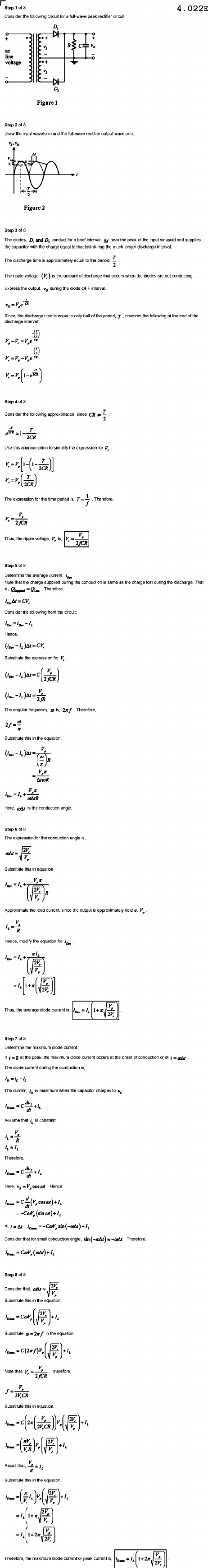 Step 1 of 8 4.022E + 9+ ac line voltage *** : Step 2 of 8 Draw waveform output waveform Figure 2 Step 3 of 8 D, and D, a brief interval near the peak inpu and the capacitor with charge equal that lost during the much longer interval The discharge approximately equal the period amount discharge the when the are Express during the OFF interval equal only half period T consider the following Step 4 of 8 Consider the following approximation since 2 2CR Use simplify the expression for 2CR The Therefore Thus, ripple Step 5 of 8 Determine average current Note charge supplied during the c conduction charge lost during That Therefore Conside following Substitute V, The Therefore conduction angle Step 6 of 8 The pression equation Approximate current since the output approximately modify equation for Thus average diode current is Step 7 of 8 Determine maximum current the maximum diode current occurs conduction current during maximum when the capacitor charges Assume is constant V. Therefore Consider Step 8 of 8 Consider that Substitute Substitute equation Therefore 2V,CR equation V.R equation