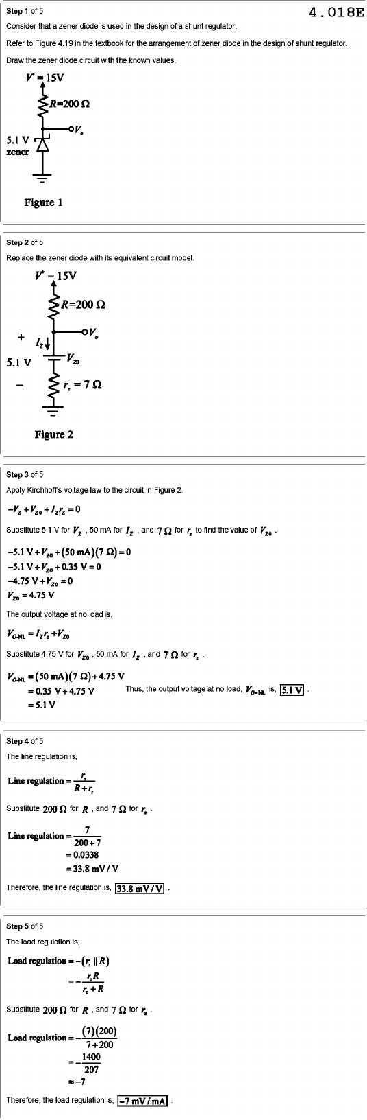 Step of 5 4.018E Consider that a zener diode is used in the design of a shunt regulator. Refer to Figure 4.19 in the textbook for the arrangement of zener diode in the design of shunt regulator. Draw the zener diode circuit with the known values. = 15V R=200 Ω 5.1 V zener Figure 1 Step 2 of 5 Replace the zener diode with its equivalent circuit model. = 15V R=200 Ω + 5.1 V - = Figure 2 Step of 5 Apply Kirchhoff's voltage law to the circuit in Figure 2. Substitute 5.1 V for V₂ 50 mA for and 7Ω for to find the value of The output voltage at no load is, Substitute 4.75 V for V₂₀ 50 mA for and 7 for Thus, the output voltage at no load, is, =5.1V Step of 5 The line regulation is, Line regulation = R+r, Substitute 200 Ω for and 7 Ω for 7 Line regulation = 200+7 = 0.0338 = 33.8 mV V Therefore, the line regulation is, 33.8 V Step 5 of 5 The load regulation is, Load = Substitute 200 Ω for R and 7Ω for Load regulation= (7)(200) 7+200 = 1400 207 ≈ -7 Therefore, the load regulation is, -7