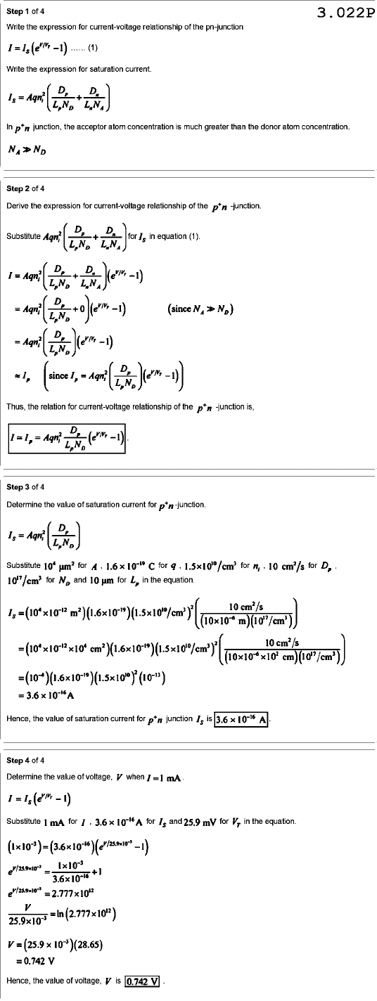 Step 1 of 4 3.022P Write the expression for current-voltage relationship of the pn-junction (1) Write the expression for saturation current. = In junction, the acceptor atom concentration is much greater than the donor atom concentration. Step 2 of 4 Derive the expression for current-voltage relationship of the p*n -junction. Substitute + for in equation (1). I = = Thus, the relation for current-voltage relationship of the -junction is, Step 3 of 4 Determine the value of saturation current for -junction. = Substitute µm² for A for for n, 10 cm²/s for D, for and 10 µm for L, in the equation. Hence, the value of saturation current for junction is 10⁻¹⁶ A Step 4 of 4 Determine the value of voltage, V when I = mA Substitute 1 mA for I 3.6 10⁻¹⁶ A for Iₛ and 25.9 mV for in the equation. =0.742 V Hence, the value of voltage, V is 0.742 V