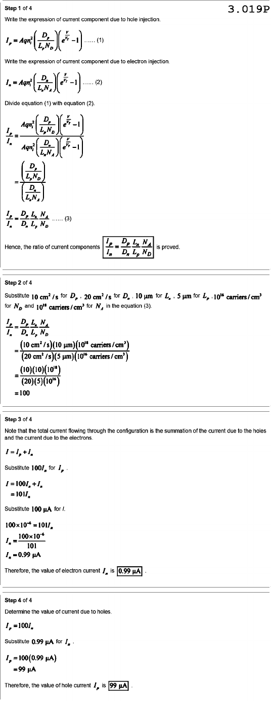 Step 1 of 4 3.019P Write the expression of current component due to hole injection. = (1) Write the expression of current component due to electron injection. = (2) Divide equation (1) with equation (2). = = (3) L, Hence, the ratio of current components = is proved. Step 2 of 4 Substitute 10 for D, , 20 for D, 10 µm for Ln , 5 µm for L, carriers/cm for and 10" carriers/ for N, in the equation (3). = = (20 = =100 Step 3 of 4 Note that the total current flowing through the configuration is the summation of the current due to the holes and the current due to the electrons. Substitute 100/, for = Substitute 100 µA for 101 Therefore, the value of electron current is 0.99 Step 4 of 4 Determine the value of current due to holes. Substitute 0.99 for = 99 Therefore, the value of hole current is 99 A