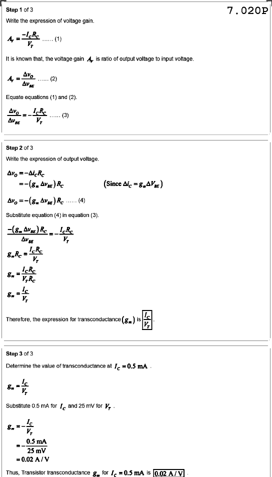 Step 1 of 3 7.020P Write the expression of voltage gain. (1) It is known that, the voltage gain A, is ratio of output voltage to input voltage. (2) Equate equations (1) and (2). (3) Step 2 of 3 Write the expression of output voltage. (Since (4) Substitute equation (4) in equation (3). = Therefore, the expression for transconductance Step 3 of 3 Determine the value of transconductance at = Substitute 0.5 mA for and 25 mV for 0.5 = 25 mV Thus, Transistor transconductance for = mA is 0.02 A/V