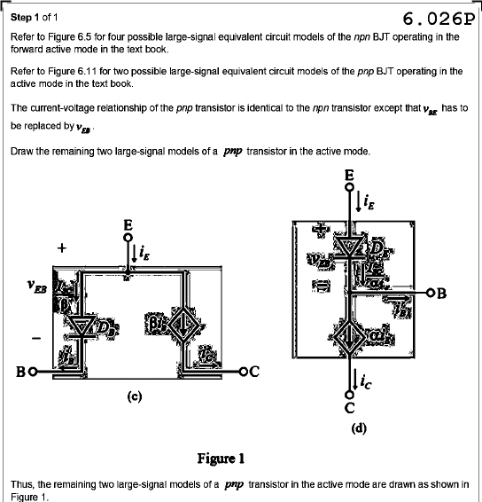 Step 1 of 1 6.026P Refer to Figure 6.5 for four possible large-signal equivalent circuit models of the npn BJT operating in the forward active mode in the text book. Refer to Figure 6.11 for two possible large-signal equivalent circuit models of the pnp BJT operating in the active mode in the text book. The current-voltage relationship of the pnp transistor is identical to the npn transistor except that has to be replaced by . Draw the remaining two large-signal models of a pnp transistor in the active mode. E E + OB ic (c) C (d) Figure 1 Thus, the remaining two large-signal models of a prip transistor in the active mode are drawn as shown in Figure 1.