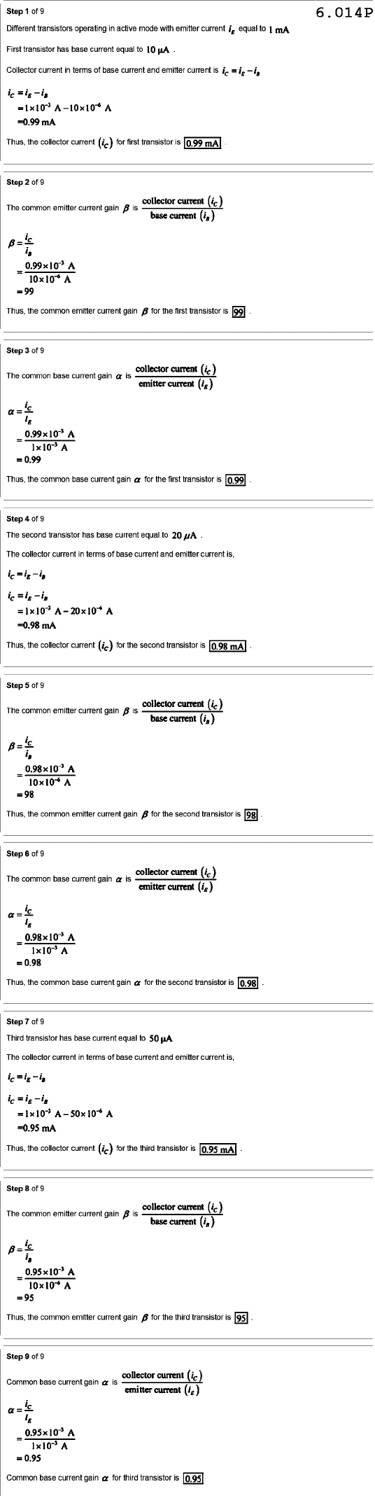 Step of 9 6.014P Different transistors operating in active mode with emitter current equal to 1 mA First transistor has base current equal to Collector current in terms of base current and emitter current is A =0.99 mA Thus, the collector current (ic) for first transistor is 0.99 mA Step of 9 collector current (ic) The common emitter current gain base current A = A =99 Thus, the common emitter current gain for the first transistor is 99 Step of 9 collector current (ic) The common base current gain a is emitter current A A = 0.99 Thus, the common base current gain a for the first transistor is 0.99 Step of 9 The second transistor has base current equal to 20 The collector current in terms of base current and emitter current is, A =0.98 mA Thus, the collector current (ic) for the second transistor 0.98 mA Step of 9 collector current (ic) The common emitter current gain is base current = A 98 Thus, the common emitter current gain for the second transistor is 98 Step of 9 collector current (ic) The common base current gain is emitter current A = A 0.98 Thus, the common base current gain a for the second transistor is 0.98 Step of 9 Third transistor has base current equal to 50 The collector current in terms of base current and emitter current is, =0.95 mA Thus, the collector current (ic) for the third transistor is 0.95 mA Step of 9 collector current (ic) The common emitter current gain is base current (i,) i, = 10x10 A =95 Thus, the common emitter current gain for the third transistor is 95 Step of 9 collector current (ic) Common base current gain a is emitter current a=ic = A 0.95 Common base current gain a for third transistor is 0.95
