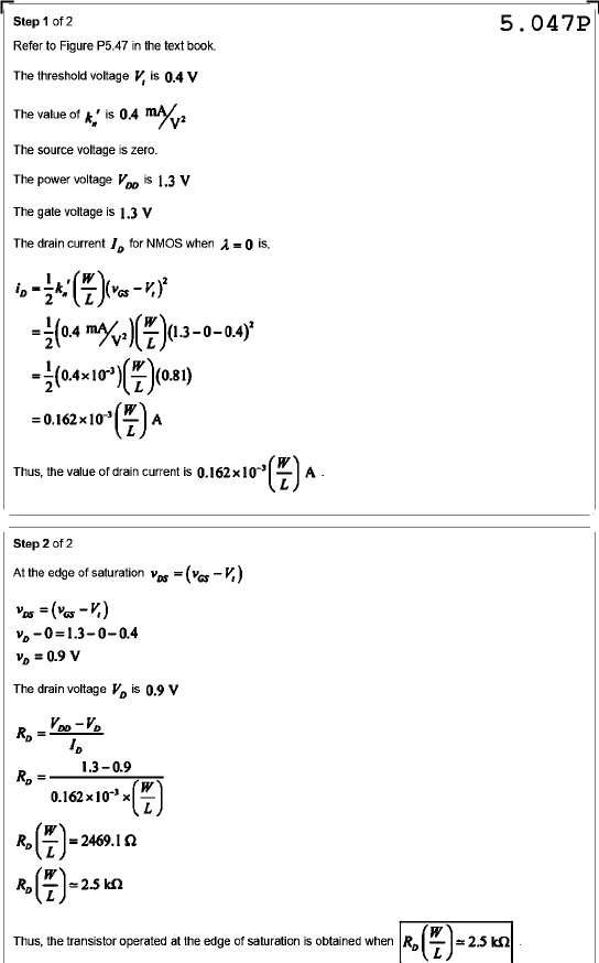 Step 1 of 2 5.047P Refer to Figure P5.47 in the text book. The threshold voltage is 0.4 V The value of is 0.4 The source voltage is zero. The power voltage is 1.3 V The gate voltage is 1.3 V The drain current for NMOS when is, Thus, the value of drain current is Step 2 of 2 At the edge of saturation The drain voltage is 0.9 V 1.3-0.9 Thus, the transistor operated at the edge of saturation is obtained when 2.5