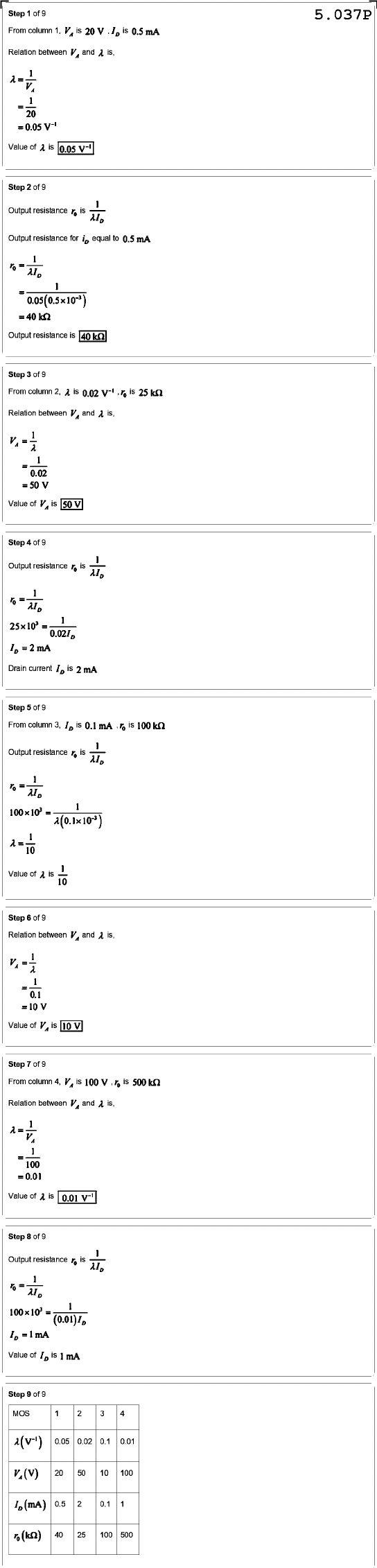 Step of 9 5.037P From column 1, is 20 V is 0.5 mA Relation between and is, 1 = 1 = 20 = 0.05 Value is 0.05 Step of 9 I Output resistance ro is AID Output resistance for equal to 0.5 mA 1 AID I = = Output resistance is Step of 9 From column 2, is 0.02 V⁻¹ is 25 kΩ Relation between and is, 1 1 = 0.02 = 50 V Value is Step of 9 Output resistance is AID 1 ro AID 1 25 = Drain current is Step of 9 From column 3, is 0.1 mA is 100 Output resistance ro is AID 1 AID 1 = 1 10 Value of is 10 Step of 9 Relation between and is, 1 1 0.1 10 V Value is Step of 9 From column 4, is 100 V ro is Relation between and is, 1 1 = 100 = 0.01 Value of is 0.01 Step of 9 Output resistance ro is AID 1 ro AID 1 = mA Value of is mA Step 9 MOS 1 2 3 4 0.05 0.02 0.1 0.01 V (v) 20 50 10 100 (mA) 0.5 2 0.1 1 40 25 100 500