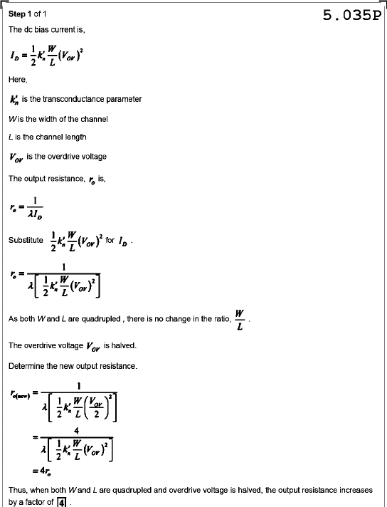 Step 1 of 1 5.035P The dc bias current is, Here, kn is the transconductance parameter Wis the width of the channel L is the channel length is the overdrive voltage The output resistance, is, Substitute W As both W and L are , there is no change in the ratio, The overdrive voltage is halved. Determine the new output resistance. Thus, when both Wand L are quadrupled and overdrive voltage is halved, the output resistance increases by a factor of 4