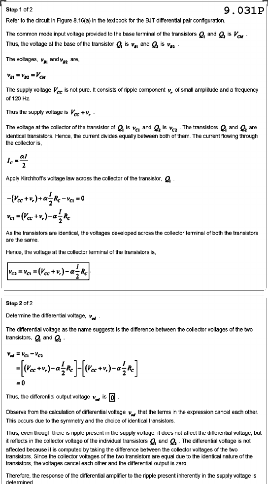 Step 1 of 2 9.031P Refer to the circuit in Figure 8.16(a) in the textbook for the BJT differential pair configuration. The common mode input voltage provided to the base terminal of the transistors and is Thus, the voltage at the base of the transistor is and is The voltages, and are, The supply voltage is not pure. It consists of ripple component v, of small amplitude and a frequency of 120 Hz. Thus the supply voltage is The voltage at the collector of the transistor of is and is The transistors and are identical transistors. Hence, the current divides equally between both of them. The current flowing through the collector is, Apply Kirchhoff's voltage law across the collector of the transistor, As the transistors are identical, the voltages developed across the collector terminal of both the transistors are the same. Hence, the voltage at the collector terminal of the transistors is, Step 2 of 2 Determine the differential voltage, The differential voltage as the name suggests is the difference between the collector voltages of the two transistors, and = Thus, the differential output voltage is 0 Observe from the calculation of differential voltage Vod that the terms in the expression cancel each other. This occurs due to the symmetry and the choice of identical transistors. Thus, even though there is ripple present in the supply voltage, it does not affect the differential voltage, but it reflects in the collector voltage of the individual transistors and The differential voltage is not affected because it is computed by taking the difference between the collector voltages of the two transistors. Since the collector voltages of the two transistors are equal due to the identical nature of the transistors, the voltages cancel each other and the differential output is zero. Therefore, the response of the differential amplifier to the ripple present inherently in the supply voltage is determined.