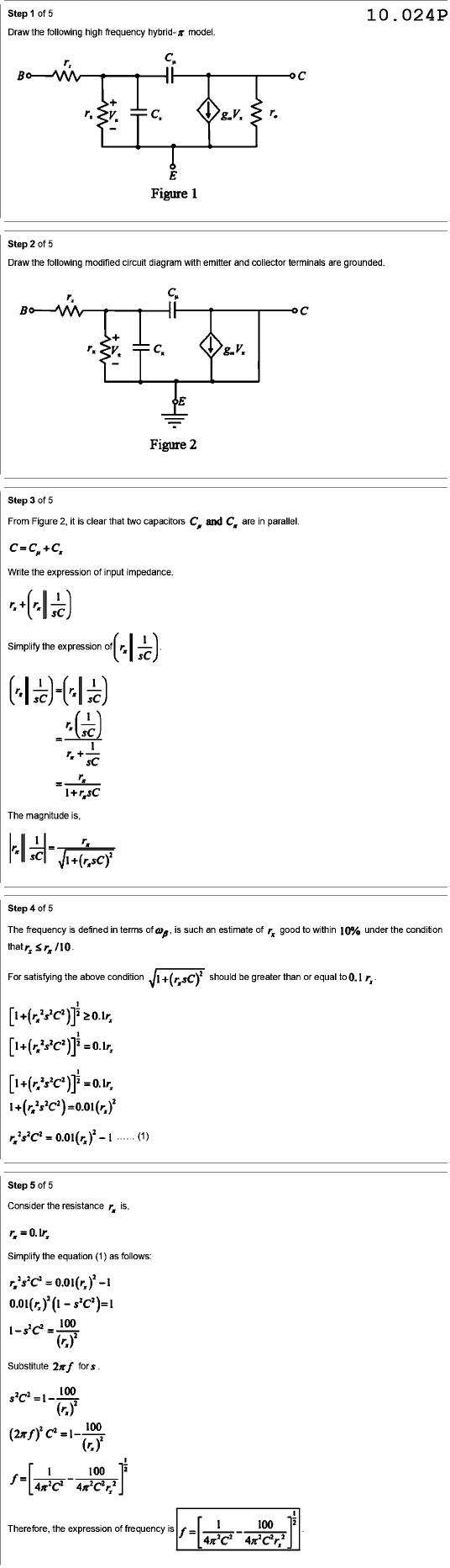 Step of 5 10.024P Draw the following high frequency hybrid-π model. r, Bo B + C, r. E Figure 1 Step of 5 Draw the following modified circuit diagram with emitter and collector terminals are grounded. r, Bo + Figure 2 Step of 5 From Figure 2, it is clear that two capacitors and are in parallel. Write the expression of input impedance. Simplify the expression of = = The magnitude is, Step of 5 The frequency is defined in terms of is such an estimate of rx good to within 10% under the condition For satisfying the above condition should be greater than or equal Step of 5 Consider the resistance is, Simplify the equation (1) as follows: 100 Substitute 1 Therefore, the expression of frequency is 100