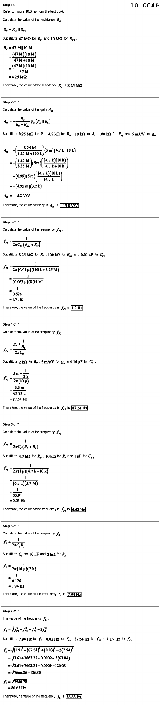 Step of 10.004P Refer to Figure 10.3 (a) from the text Calculate the value of the resistance RG Substitute 47 for RGI and 10 for M (47M)(10M) = 47M+10M = Therefore, the value of the resistance RG is Step of 7 Calculate the value of the gain AM AM = RG Substitute 8.25 for RG for RD 10 for 100 for and 5 mA/V for 8.25 M AM = (4.7k)(10k) 8.35 M 4.7k+10k 14.7k AM V/V Therefore, the value of the gain AM is -15.8 V/V -15.8 V/V Step of 7 Calculate the value of the frequency 1 Substitute 8.25 MΩ for RG for and 0.01 for M) = 1 0.526 1.9 Hz Therefore, the value of the frequency is is 1.9 Hz Step of 7 Calculate the value of the frequency for Substitute 2 for Rs 5 mA/V for and 10 for Cₛ 1 2k 62.83 Hz Therefore, the value of the frequency is is 87.54 Hz Step of 7 Calculate the value of the frequency Substitute 4.7 for RD 10 for and for I 1 1 = 35.91 0.03 Hz Therefore, the value of the frequency is is 0.03 Step of 7 Calculate the value of the frequency 1 Substitute for 10 and for Rs 1 0.126 7.94 Hz Therefore, the value of the frequency is 7.94 Hz Step The value of the frequency Substitute 7.94 Hz for 0.03 Hz for 87.54 Hz for and 1.9 Hz for = = = =86.63 Hz Therefore, he value of the frequency IS 86.63