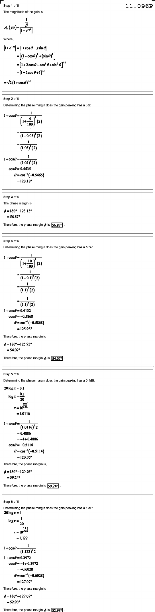 Step of 6 11.096P The magnitude of the gain is 1 Where, Step of 6 Determining the phase margin does the gain peaking has a 5%: 1 1 = = 1 =123.13° Step of 6 The phase margin is, =56.87° Therefore, the phase margin is 56.87° Step of 6 Determining the phase margin does the gain peaking has a 10%: 1 = = 1 = Therefore, the phase margin is =54.07° Therefore, the phase margin is 54.07° Step of 6 Determining the phase margin does the gain peaking has a 0.1dB: 0.1 20 = 1.0116 1 =0.4886 =-1+0.4886 =120.76° Therefore, the phase margin is, 59.24° Therefore, the phase margin is 59.24° Step of 6 Determining the phase margin does the gain peaking has a dB: logx = 20 =1.122 Therefore, the phase margin is 52.93° Therefore, the phase margin is 52.93°
