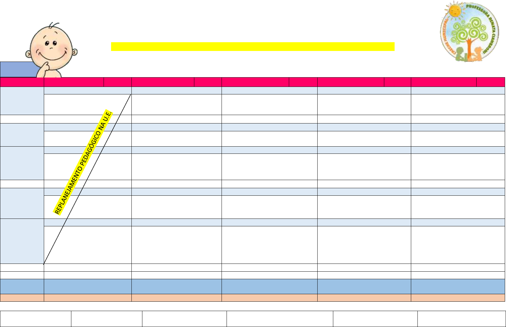 Creche Municipal Professora Renata Cianbroni Av. Condessa de Vimieiros – nº 1459 | Centro | CEP: 11.740-000 | Itanhaém – SP Telefone: (13) 3427 22 27 | WhatsApp: (13) 3426 38 37 | E-mail: crechesaojose@educaita.com.br O planejamento semanal é flexível e está sujeito a alterações conforme necessidade da rotina diária. PLANEJAMENTO SEMANAL DE VIVÊNCIAS: EDUCAÇÃO INFANTIL – CRECHE / 2025 HORÁRIOS SEGUNDA-FEIRA 28 TERÇA-FEIRA 29 QUARTA-FEIRA 30 QUINTA-FEIRA 31 SEXTA-FEIRA 01 7h30 às 7h45 1ª Vivência EO | EF EO | EF EO | EF EO | EF EO | EF Acolhimento na entrada; Materiais de largo alcance. Acolhimento na entrada; Brinquedos sonoros. Acolhimento na entrada; Materiais de largo alcance. Acolhimento na entrada; Brinquedos estruturados. 7h45 às 8h Lanche da manhã Lanche da manhã Lanche da manhã Lanche da manhã 8h às 8h30 2ª Vivência CG | TS CG CG | ET CG CG | TS Banho de Sol / Parque. Banho de Sol / Parque. Banho de Sol / Parque. Banho de Sol / Parque. 8h30 às 9h 3ª VivênciaEO | EF | TS | ET EO | EF | TS | ET EO | EF | TS | ET EO | EF | TS | ET EO | EF | TS | ET Rotina permanente: Chamadinha, contagem e cantiga, história. Rotina permanente: Chamadinha, contagem e cantigas, história. Rotina permanente: Chamadinha, contagem e cantigas, história. Rotina permanente: Chamadinha, contagem e cantiga, história. 9h às 9h10 Hidratação Hidratação Hidratação Hidratação 9h10 às 9h40 4ª Vivência EF | CG EF | CG EF | CG EF | CG EF | CG Brincadeira livre (intervalo da professora). Organização de vivência. Brincadeira livre (intervalo da professora). Organização de vivência. Brincadeira livre (intervalo da professora). Organização de vivência. Brincadeira livre (intervalo da professora). Organização de vivência. 9h40 às 10h30 5ª Vivência TS CG TS ET TS Acolhimento brincante na sala com materiais de largo alcance (individual). Trocas (higiene). Musicalização com materiais metálicos – Investigações sonoras (individual). Trocas (higiene). Território brincante com bolas – Investigações comparativas com bolas de diferentes tamanhos, pesos e densidades. Trocas (higiene) Territórios brincantes no quintal: Leitura, musical e materiais de largo alcance (coletivo). Trocas (higiene) 10h30 às 11h Almoço Almoço Almoço Almoço 11h às 13h Higiene / Soninho Higiene / Soninho Higiene / Soninho Higiene / Soninho Total – 23h 7h30 às 12h30 - 5h 7h30 às 12h30 - 5h 7h30 às 12h30 - 5h 7h30 às 11h30 – 4h 7h30 às 11h30 HAL - 7h HAI HAC HAI HA HAI HAI MATRIZ CURRICULAR 23h semanais O EU, O OUTRO E O NÓS - 4H ESCUTA, FALA, PENSAMENTO E IMAGINAÇÃO - 6H ESPAÇOS, TEMPOS, QUANTIDADES, RELAÇÕES E TRANSFORMAÇÕES – 3H CORPO, GESTOS E MOVIMENTOS – 5H TRAÇOS, SONS, CORES E FORMAS – 5H VOLTA ÀS AULAS: Acolhimento pós Recesso -Escolar | SEMANA: 28 de julho à 01 de agosto JULHO Creche Municipal Professora Renata Cianbroni Av. Condessa de Vimieiros – nº 1459 | Centro | CEP: 11.740-000 | Itanhaém – SP Telefone: (13) 3427 22 27 | WhatsApp: (13) 3426 38 37 | E-mail: crechesaojose@educaita.com.br O planejamento semanal é flexível e está sujeito a alterações conforme necessidade da rotina diária. PLANEJAMENTO SEMANAL DE VIVÊNCIAS: EDUCAÇÃO INFANTIL – CRECHE / 2025 BERÇÁRIOS: 1 e 2 A,B,C PROFESSORAS: Márcia, Nátali, Roseli, Amanda HORÁRIOS SEGUNDA-FEIRA 04 TERÇA-FEIRA 05 QUARTA-FEIRA 06 QUINTA-FEIRA 07 SEXTA-FEIRA 08 7h30 às 7h45 1ª Vivência EO | EF EO | EF EO | EF EO | EF EO | EF Acolhimento na entrada; Brincadeira simbólica. Acolhimento na entrada; Materiais de largo alcance. Acolhimento na entrada; Materiais de largo alcance. Acolhimento na entrada; Materiais de largo alcance. Acolhimento na entrada; Brinquedos estruturados. 7h45 às 8h Lanche da manhã Lanche da manhã Lanche da manhã 8h às 8h30 2ª VivênciaCG | TS CG CG | ET CG CG | TS Banho de Sol / Parque. Banho de Sol / Parque. Banho de Sol / Parque. Banho de Sol / Parque. Banho de Sol / Parque. 8h30 às 9h 3ª Vivência EO | EF | TS | ET EO | EF | TS | ET EO | EF | TS | ET EO | EF | TS | ET EO | EF | TS | ET Rotina permanente: Chamadinha, contagem e cantigas, história. Rotina permanente: Chamadinha, contagem e cantiga,história. Rotina permanente: Chamadinha, contagem e cantiga, história. Rotina permanente: Chamadinha, contagem e cantiga, história. Rotina permanente: Chamadinha, contagem e cantigas, história. 9h às 9h10 Hidratação Hidratação Hidratação Hidratação 9h10 às 9h40 4ª Vivência EF | CG EF | CG EF | CG EF | CG EF | CG Brincadeira livre (intervalo da professora). Organização de vivência. Brincadeira livre (intervalo da professora). Organização de vivência. Brincadeira livre (intervalo da professora). Organização de vivência. Brincadeira livre (intervalo da professora). Organização de vivência. Brincadeira livre (intervalo da professora). Organização de vivência. 9h40 às 10h30 5ª Vivência TS CG TS ET TS “Piquenique da lagarta comilona” Contação de história com musicalização (coletivo); Degustação do cardápio saldável do livro (individual); Trocas (higiene). Contexto desafiador com verduras: Puxar, rasgar, arremessar, transpor e desfolhar (coletivo). Trocas (higiene). Ateliê de pintura com tinta natural de beterraba (individual). Trocas (higiene). Preparando suco de laranja natural (coletivo). Trocas (higiene). Cantina vegetariana: Macarrão de cenoura e abobrinha com molho de tomate natural (coletivo). Trocas (higiene). 10h30 às 11h Almoço Almoço Almoço Almoço 11h às 13h Higiene / Soninho Higiene / Soninho Higiene / Soninho Higiene / Soninho Total – 23h 7h30 às 12h30 - 5h 7h30 às 12h30 - 5h 7h30 às 12h30 - 5h 7h30 às 11h30 – 4h 7h30 às 11h30 HAL - 7h HAI HAC HAI HA HAI HAI MATRIZ CURRICULAR 23h semanais O EU, O OUTRO E O NÓS - 4H ESCUTA, FALA, PENSAMENTO E IMAGINAÇÃO - 6H ESPAÇOS, TEMPOS, QUANTIDADES, RELAÇÕES E TRANSFORMAÇÕES – 3H CORPO, GESTOS E MOVIMENTOS – 5H TRAÇOS, SONS, CORE