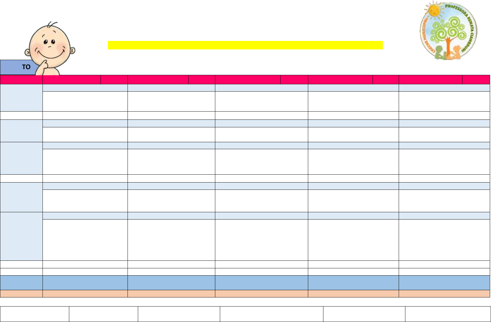 Creche Municipal Professora Renata Cianbroni Av. Condessa de Vimieiros – nº 1459 | Centro | CEP: 11.740-000 | Itanhaém – SP Telefone: (13) 3427 22 27 | WhatsApp: (13) 3426 38 37 | E-mail: crechesaojose@educaita.com.br O planejamento semanal é flexível e está sujeito a alterações conforme necessidade da rotina diária. PLANEJAMENTO SEMANAL DE VIVÊNCIAS: EDUCAÇÃO INFANTIL – CRECHE / 2025 HORÁRIOS SEGUNDA-FEIRA 25 TERÇA-FEIRA 26 QUARTA-FEIRA 27 QUINTA-FEIRA 28 SEXTA-FEIRA 29 7h30 às 7h45 1ª Vivência EO | EF EO | EF EO | EF EO | EF EO | EF Acolhimento na entrada; Materiais de largo alcance. Acolhimento na entrada; Brinquedos estruturados Acolhimento na entrada; Brinquedos sonoros. Acolhimento na entrada; Materiais de largo alcance. Acolhimento na entrada; Brinquedos estruturados. 7h45 às 8h Lanche da manhã Lanche da manhã Lanche da manhã Lanche da manhã 8h às 8h30 2ª Vivência CG | TS CG CG | ET CG CG | TS Banho de Sol / Parque. Banho de Sol / Parque. Banho de Sol / Parque. Banho de Sol / Parque. Banho de Sol / Parque. 8h30 às 9h 3ª VivênciaEO | EF | TS | ET EO | EF | TS | ET EO | EF | TS | ET EO | EF | TS | ET EO | EF | TS | ET . Rotina permanente: Chamadinha, contagem e cantiga, história. Rotina permanente: Chamadinha, contagem e cantiga, história. Rotina permanente: Chamadinha, contagem e cantigas, história. Rotina permanente: Chamadinha, contagem e cantigas, história. Rotina permanente: Chamadinha, contagem e cantiga, história. 9h às 9h10 Hidratação Hidratação Hidratação Hidratação 9h10 às 9h40 4ª Vivência EF | CG EF | CG EF | CG EF | CG EF | CG Brincadeira livre (intervalo da professora). Organização de vivência. Brincadeira livre (intervalo da professora). Organização de vivência. Brincadeira livre (intervalo da professora). Organização de vivência. Brincadeira livre (intervalo da professora). Organização de vivência. Brincadeira livre (intervalo da professora). Organização de vivência. 9h40 às 10h30 5ª Vivência PL PL TS ET TS O Jornal – Contação da história com espaço brincante inspirado nos elementos do livro (coletivo). Trocas (higiene). Território brincante com riscantes - Livre exploração, com diferentes possibilidades usando jornal (individual). Trocas (higiene). Higiene de bonecas – Brincadeira simbólica de limpar, trocar e higienizar bonecas e bonecos (individual). Trocas (higiene). Higiene bucal – Brincadeira simbólica de escovar os dentinhos com suportes brincantes; Trocas (higiene). Higiene corporal – Brincadeira simbólica de incentivo à higiene corporal - Spa baby |hora do banho (individual). Trocas (higiene). 10h30 às 11h Almoço Almoço Almoço Almoço 11h às 13h Higiene / Soninho Higiene / Soninho Higiene / Soninho Higiene / Soninho Total – 23h 7h30 às 12h30 - 5h 7h30 às 12h30 - 5h 7h30 às 12h30 - 5h 7h30 às 11h30 – 4h 7h30 às 11h30 HAL - 7h HAI HAC HAI HA HAI HAI MATRIZ CURRICULAR 23h semanais O EU, O OUTRO E O NÓS - 4H ESCUTA, FALA, PENSAMENTO E IMAGINAÇÃO - 6H ESPAÇOS, TEMPOS, QUANTIDADES, RELAÇÕES E TRANSFORMAÇÕES – 3H CORPO, GESTOS E MOVIMENTOS – 5H TRAÇOS, SONS, CORES E FORMAS – 5H CRONOGRAMA: Projeto de Leitura | Higiene e Saúde | SEMANA: 25 à 29 de Agosto AGOSTO