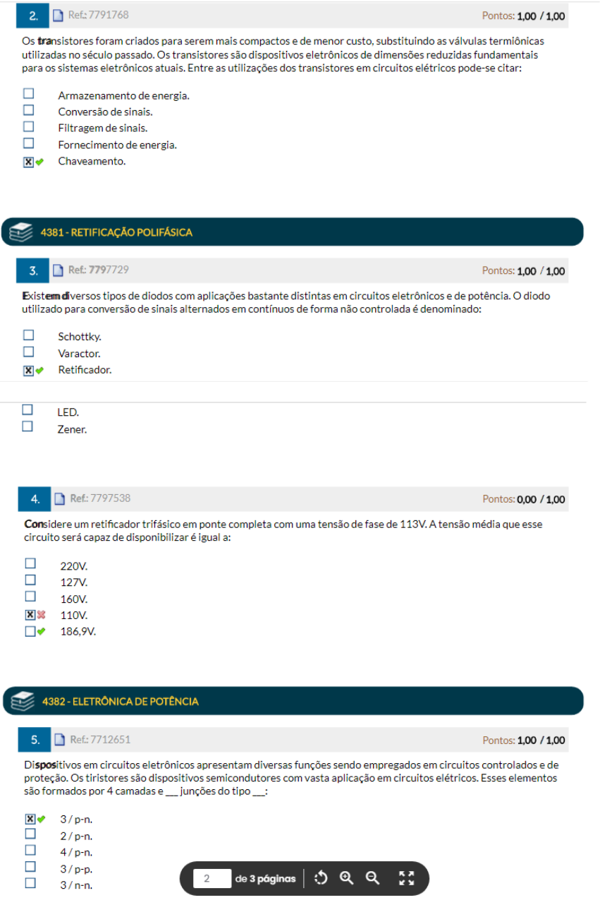 ======================================================================= Os circuitos PCR, diferentemente dos retificadores a diodo, possuem a vantagem de serem capazes de: a) Bloquearem a corrente em condição de polarização reversa. b) Conduzirem apenas em polarização direta c) Oferecerem controle sobre a tensão média na saída do retificador. d) Retificarem sinais alternados em meia onda e) Retificarem sinais alternados em onda completa. Apesar de não serem recomendados para uso em eletrônica de potência, os transistores do tipo TBJ possuem algumas similaridades com os dispositivos de potência, entre elas: a) Tolerância a elevadas correntes. b) O curso elevado. c) A possibilidade de serem empregados como chave. d) Suportarem elevadas tensões. e) A possibilidade de serem empregados como amplificadores de potência. image6.png image1.png image2.png image3.png image4.png image5.png
