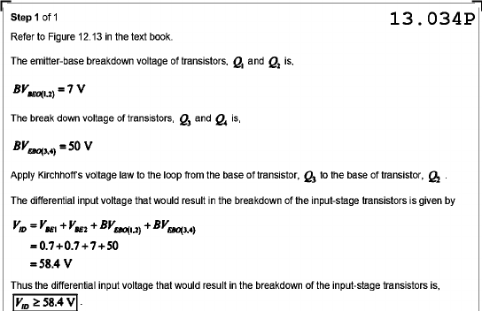 Step 1 of 1 13.034P Refer to Figure 12.13 in the text book. The emitter-base breakdown voltage of transistors, and is, The break down voltage of transistors, and is, Apply Kirchhoff's voltage law to the loop from the base of transistor, to the base of transistor, The differential input voltage that would result in the breakdown of the input-stage transistors is given by =0.7+0.7+7+50 =58.4 V Thus the differential input voltage that would result in the breakdown of the input-stage transistors is, -