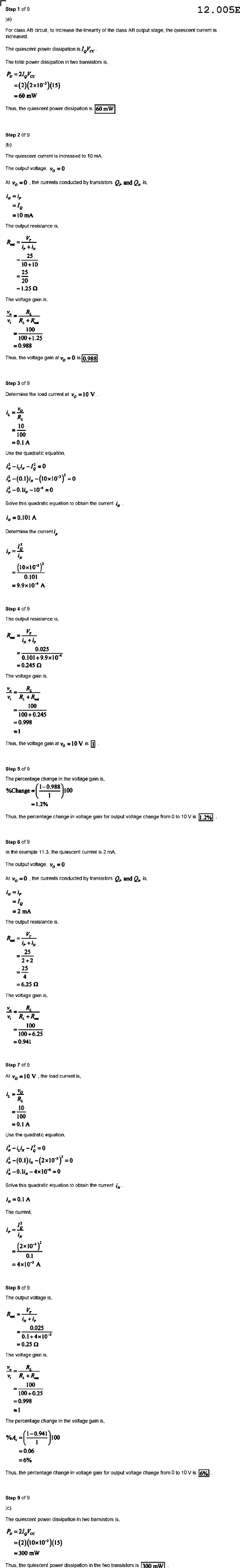 Step 12.005E (a) For class AB circuit, Increase the linearity of the class AB output stage, the quiescent current is increased. The quiescent power dissipation The total power dissipation two transistors the quiescent power dissipation Step 2 of 9 (b) The current increased =0 At =0 the currents conducted by transistors $ and =10 mA The output resistance 25 10+10 25 20 =1.25 Ω The voltage 100 =0.988 voltage gain =0 0.988 Step 3 of 9 Determine the load =10 V 10 100 =0.1A Use quadratic =0 this quadratic equation obtain the current Determine 0.101 Step The output resistance 0.025 0.101 The voltage 100 =0.998 Thus voltage gain Step The percentage change voltage 1-0.988 %Change 100 =1.2% the percentage voltage gain for output voltage change from to Step example 11.3 the quiescent current mA voltage At =0 the currents conducted by transistors and The output 25 2+2 25 The voltage gain is 100 100+6.25 =0.941 the 10 100 =0.1A Use quadratic =0 Solve this equation obtain the current 0.1 A Step 8 of 9 The output voltage 0.025 = =0.25 Ω The voltage 100 100+0.25 =0.998 The percentage change the voltage 100 =0.06 =6% Thus the percentage for output voltage change from to 6% Step (c) power dissipation in two transistors Thus transistors