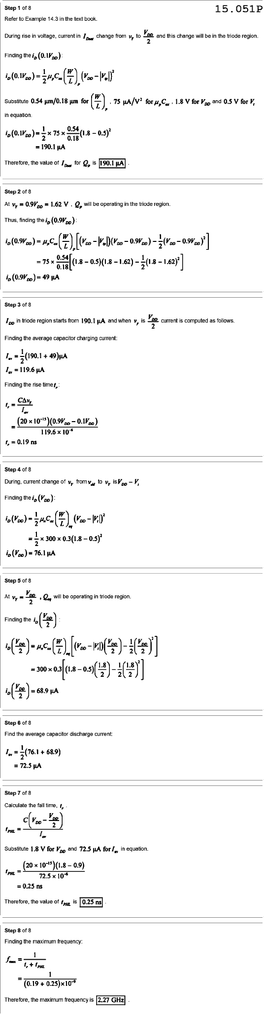 Step of 8 15.051P Refer to Example 14.3 in the text book. During rise in voltage, current in change from to and this change will be in the triode region. 2 Finding the Substitute 0.54 µm/0.18 for W 75 for 1.8 V for and 0.5 V for in equation. Therefore, the value of for Q, is Step of 8 At = = 1.62 V will be operating in the triode region. Thus, finding the = 0.18 Step of 8 in triode region starts from 190.1 and when is current is computed as follows. 2 Finding the average capacitor charging current: Finding the rise = Step of 8 During, current change of from to Finding the Step of 8 At will be operating in triode region. Finding the Step of 8 Find the average capacitor discharge current: Step of 8 Calculate the fall time, 1, Substitute 1.8 V for and 72.5 in equation. = = 0.25 ns Therefore, the value of PHL is 0.25 ns Step of 8 Finding the maximum frequency: 1 1 = Therefore, the maximum frequency is 2.27 GHz 2.27 GHz