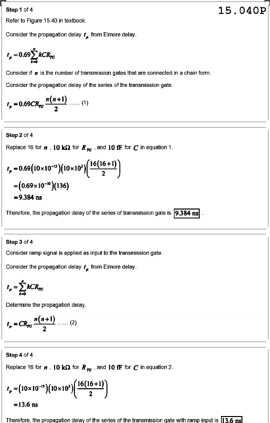 Step 1 of 4 15.040P Refer to Figure 15.40 in textbook. Consider the propagation delay from Elmore delay. Consider if n is the number of transmission gates that are connected in a chain form. Consider the propagation delay of the series of the transmission gate. (1) Step 2 of 4 Replace 16 for 10 kΩ for 1 and 10 fF for C in equation 1. = =9.384 ns Therefore, the propagation delay of the series of transmission gate is 9.384 ns . Step 3 of 4 Consider ramp signal is applied as input to the transmission gate. Consider the propagation delay from Elmore delay. Determine the propagation delay. (2) Step 4 of 4 Replace 16 for 10 kΩ for and 10 fF for C in equation 2. =13.6 ns Therefore, the propagation delay of the series of the transmission gate with ramp input is 13.6 ns