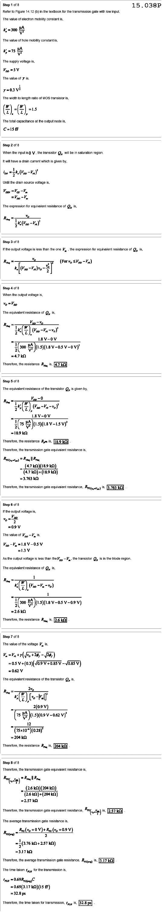 Step of 8 15.038P Refer Figure 14 12 (b) in the textbook for the transmission gate with low input. The value of electron mobility The value mobility constant The supply voltage is, The value The width to length ratio of MOS transistor is, The total capacitance at the output node is, Step When the input the transistor will be in saturation region It will have drain current which Until the drain source voltage is The expression for equivalent resistance of 2 Step of 8 If the output voltage is less than the one the expression for equivalent resistance of is, Step of 8 When the output voltage is, The equivalent resistance of is, 2 - 300 Therefore, the resistance Step The equivalent resistance of the transistor given by, 1.8V-0V =18.9 Therefore, the resistance IS, Therefore, the transmission gate equivalent resistance is Therefore, the transmission gate equivalent resistance, IS 763 Step of 8 If the output voltage is, The value As the output voltage is less than DD the transistor is the triode region The equivalent resistance of is, 1 - 300 Therefore, the resistance Step The value the voltage is, =0.62 V The equivalent resistance of the transistor 2(0.9 V) 12 Therefore, the resistance is, Step of 8 Therefore, the transmission gate equivalent resistance is = Therefore, the transmission gate equivalent resistance, R The average transmission gate resistance is, 2 Therefore, the average transmission gate The time taken for the Therefore, the time taken for 32.8 ps
