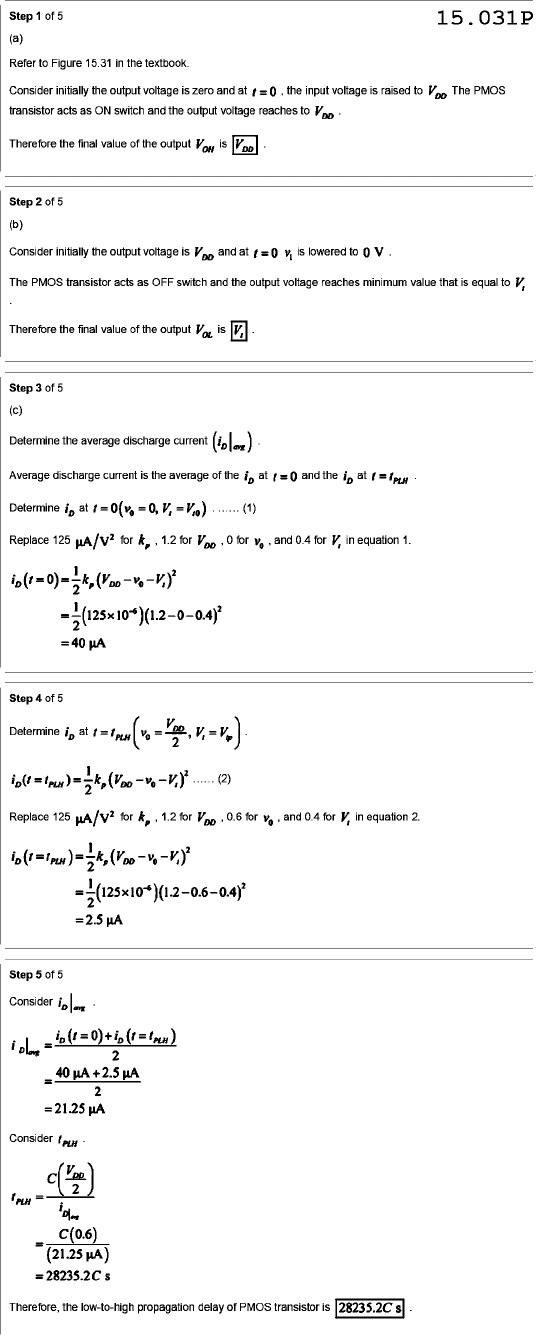 Step 1 of 5 15.031P (a) Refer to Figure 15.31 in the textbook. Consider initially the output voltage is zero and at , the input voltage is raised to The PMOS transistor acts as ON switch and the output voltage reaches to Therefore the final value of the output is Step 2 of 5 (b) Consider initially the output voltage is and at is lowered to The PMOS transistor acts as OFF switch and the output voltage reaches minimum value that is equal to Therefore the final value of the output is V, Step 3 of 5 (c) Determine the average discharge current Average discharge current is the average of the iD at and the iD at Determine at = 0, = (1) Replace 125 for , 1.2 for 0 for and 0.4 for in equation 1. = Step 4 of 5 Determine iD Replace 125 for k, , 1.2 for , 0.6 for and 0.4 for in equation 2. Step 5 of 5 Consider = Consider C(0.6) = Therefore, the low-to-high propagation delay of PMOS transistor is 28235.2C s