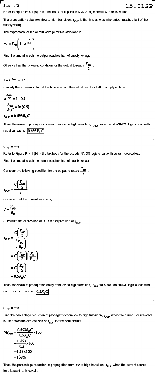 Step 1 of 3 15.012P Refer to Figure P14.1 (a) in the textbook for a pseudo-NMOS logic circuit with resistive load. The propagation delay from low to high transition, 'PLH is the time at which the output reaches half of the supply voltage. The expression for the output voltage for resistive load is, Find the time at which the output reaches half of supply voltage. Observe that the following condition for the output to reach Simplify the expression to get the time at which the output reaches half of supply voltage. Thus, the value of propagation delay from low to high transition, 'PLH for a pseudo-NMOS logic circuit with resistive load is, - Step 2 of 3 Refer to Figure P14.1 (b) in the textbook for the pseudo-NMOS logic circuit with current-source load. Find the time at which the output reaches half of supply voltage. Consider the following condition for the output to reach Consider that the current source is, Substitute the expression of I in the expression of = = Thus, the value of propagation delay from low to high transition, 'PLH for a pseudo-NMOS logic circuit with current-source load is, Step 3 of 3 Find the percentage reduction of propagation from low to high transition, 'PLH when the current source-load is used from the expressions of 'PLH for the both circuits. =1.38x100 =138% Thus, the percentage reduction of propagation from low to high transition, 'PLH when the current source- load is used is, 138%