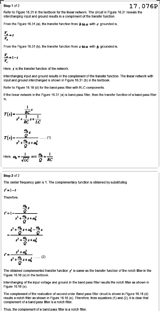 Step 1 of 2 17.076P Refer to Figure 16.31 in the textbook for the linear network. The circuit in Figure 16.31 reveals the interchanging input and ground results in a compliment of the transfer function. From the Figure 16.31 (a), the transfer function from b to a with c grounded is, From the Figure 16.31 (b), the transfer function from to a with b grounded is, Here, 1 is the transfer function of the network. Interchanging input and ground results in the complement of the transfer function. The linear network with input and ground interchanged is shown in Figure 16.31 (b) in the textbook. Refer to Figure 16.18 (d) for the band-pass filter with RLC components. If the linear network in the Figure 16.31 (a) is band-pass filter, then the transfer function of a band pass filter is, T (1) Here, Step 2 of 2 The center frequency gain is 1. The complementary function is obtained by substituting Therefore, = (2) The obtained complemented transfer function is same as the transfer function of the notch filter in the Figure 16.18 (e) in the textbook. Interchanging of the input voltage and ground in the band pass filter results the notch filter as shown in Figure 16.18 (e). The complement of the realization of second-order Band pass filter circuit is shown in Figure 16.18 (d) results a notch filter as shown in Figure 16.18 (e). Therefore, from equations (1) and (2), it is clear that complement of a band pass filter is a notch filter. Thus, the complement of a band pass filter is a notch filter.