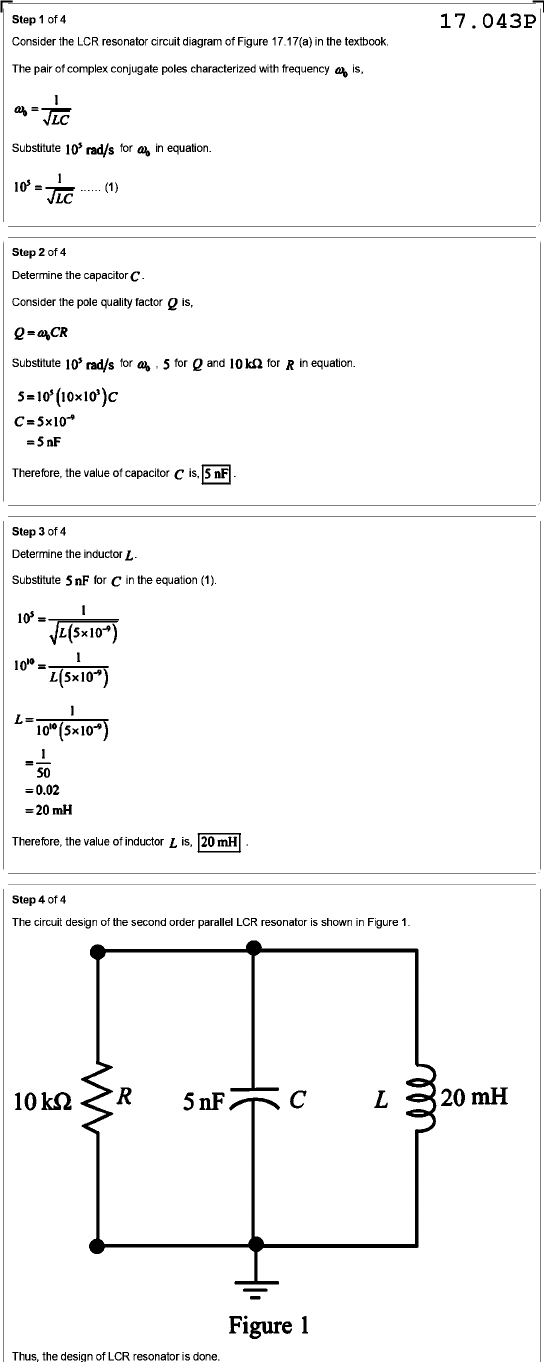 Step 1 of 4 17.043P Consider the LCR resonator circuit diagram of Figure 17.17(a) in the textbook. The pair of complex conjugate poles characterized with frequency is, = Substitute 10⁵ rad/s for in equation. 10⁵ = JLC 1 (1) Step 2 of 4 Determine the capacitor C. Consider the pole quality factor Q is, Substitute 10⁵ rad/s for 5 for Q and 10 kΩ for R in equation. = = nF Therefore, the value of capacitor is, 5 nF - Step 3 of 4 Determine the inductor L. Substitute 5 nF for in the equation (1). 10⁵ = = 1 L = 1 = 50 =0.02 = 20 mH Therefore, the value of inductor L is, 20 mH Step 4 of 4 The circuit design of the second order parallel LCR resonator is shown in Figure 1. 10 kΩ R 5 nF C L 20 mH Figure 1 Thus, the design of LCR resonator is done.