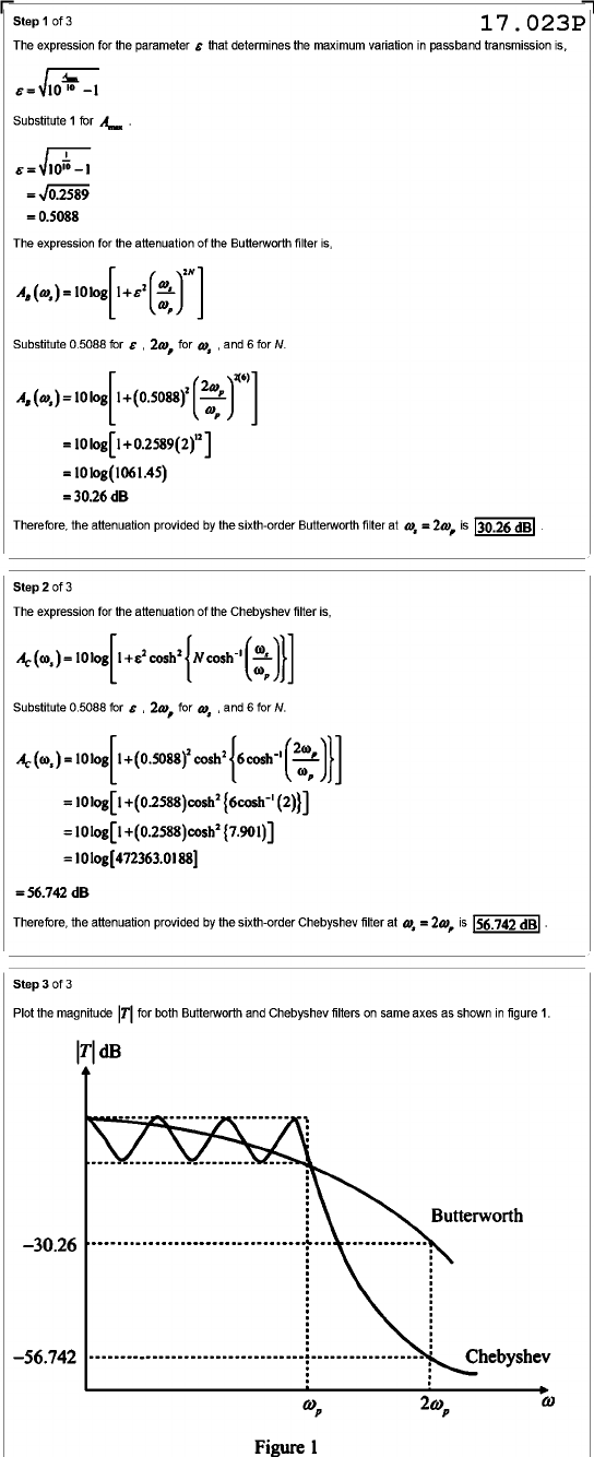 Step 1 of 3 17.023P The expression for the parameter E that determines the maximum variation in passband transmission is, E Substitute 1 for E =0.5088 The expression for the attenuation of the Butterworth filter is, Substitute 0.5088 for for w, and 6 for N. Therefore, the attenuation provided by the sixth-order Butterworth filter at = is 30.26 dB Step 2 of 3 The expression for the attenuation of the Chebyshev filter is, Substitute 0.5088 for for w, and 6 for N. Therefore, the attenuation provided by the sixth-order Chebyshev filter at w, = is 56.742 dB . Step 3 of 3 Plot the magnitude for both Butterworth and Chebyshev filters on same axes as shown in figure 1. dB Butterworth -30.26 -56.742 Chebyshev Figure 1