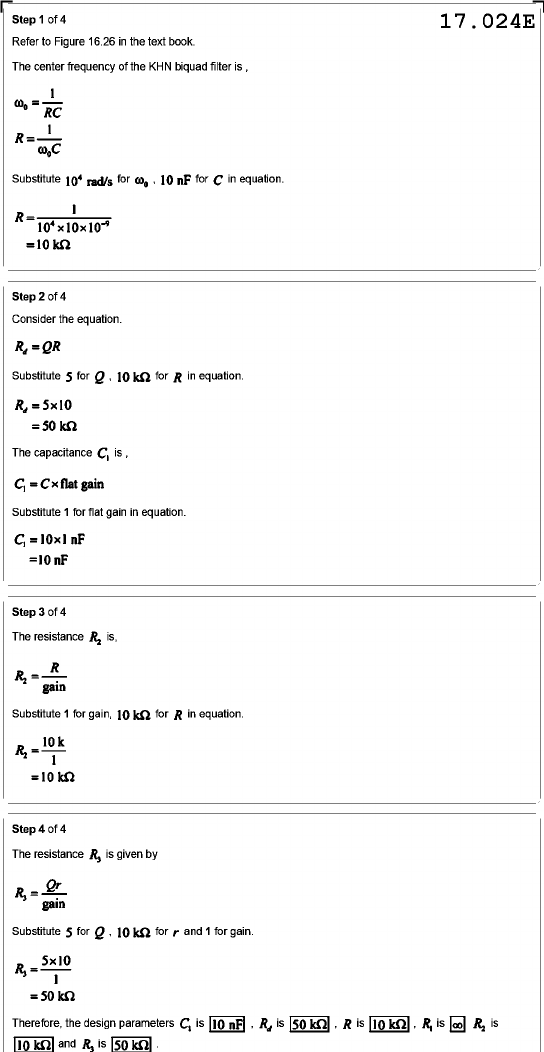 Step 1 of 4 17.024E Refer to Figure 16.26 in the text book. The center frequency of the KHN biquad filter is, R Substitute rad/s for , 10 nF for in equation. = 10 kΩ Step 2 of 4 Consider the equation. Rd = QR Substitute 5 for 10 kΩ for R in equation. Rd = 5x10 = 50 kΩ The capacitance C₁ is C₁ = flat gain Substitute 1 for flat gain in equation. = 10x1 nF = 10 nF Step 3 of 4 The resistance is, R Substitute 1 for gain, 10 kΩ for R in equation. = 10 kΩ Step 4 of 4 The resistance is given by = gain Substitute 5 for 10 kΩ for r and 1 for gain. = 50 kΩ Therefore, the design parameters is 10 nF Rd is , R is , is is 10 kΩ and is 50 kΩ