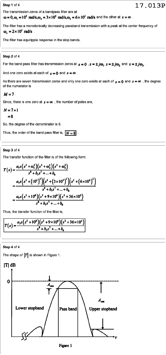 Step 1 of 4 17.013P The transmission zeros of a bandpass filter are at = = = rad/s and the other at The filter has a monotonically decreasing passband transmission with a peak at the center frequency of The filter has equiripple response in the stop bands. Step 2 of 4 For the band pass filter has transmission zeros at s=0 = = and And one zero exists at each of s=0 and As there are seven transmission zeros and only one zero exists at each of s=0 and the degree of the numerator is Since, there is one zero at the number of poles are, N = 7+1 = 8 So, the degree of the denominator is 8. Thus, the order of the band pass filter is, Step 3 of 4 The transfer function of the filter is of the following form: T(s) = = = Thus, the transfer function of the filter is, T(s) = Step 4 of 4 The shape of |T| is shown in Figure 1. dB 0 Lower stopband Pass band Upper stopband Figure 1