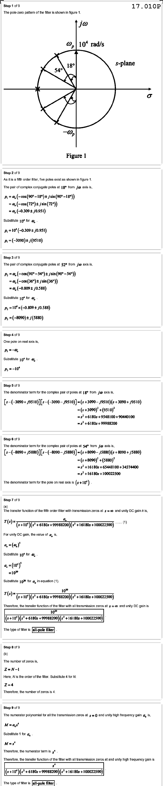 Step of 9 17.010P The pole zero pattern of the filter is shown in figure 1. 10⁴ rad/s 18° s-plane 54° σ Figure 1 Step of 9 As it is a fifth order filter, five poles exist as shown in figure 1 The pair of complex conjugate poles at 18° from axis is, Substitute for w. Step of 9 The pair of complex conjugate poles at 52° from axis is, Substitute for Step 9 One pole on real axis is, Substitute for w. Step 9 The denominator term for the complex pair of poles at 18° from axis Step of 9 The denominator term for the complex pair of poles at 54° from axis is, =s²+16180s+65448100+34574400 The denominator term for the pole on real axis is Step (a) The transfer function of the fifth order filter with transmission zeros at = 00 and unity DC gain is, T(s)= (1) For unity DC gain, the value of is, Substitute for w. Substitute 1020 for in equation (1). Therefore, the transfer function of the filter with all transmission zeros at 00 and unity DC is 1020 The type of filter all-pole filter Step (b) The number zeros is, Here, the order of the filter. Substitute for N. Therefore, the number of zeros Step of 9 The numerator polynomial for all the transmission zeros at $ 0 and unity high frequency gain a, IS, M Substitute for a, Therefore, the numerator term Therefore, the transfer function of the filter with all transmission zeros at and unity high frequency gain is The type of filter all-pole filter