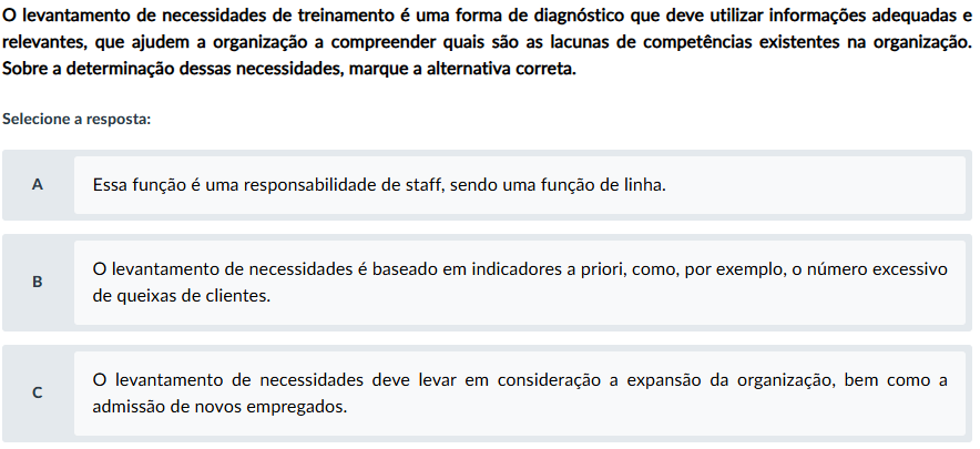levantamento de necessidades de treinamento é uma forma de diagnóstico que deve utilizar informações adequadas e relevantes, que ajudem a organização a compreender quais são as lacunas de competências existentes na organização. Sobre a determinação dessas necessidades, marque a alternativa correta. Selecione a resposta: A Essa função é uma responsabilidade de staff, sendo uma função de linha. O levantamento de necessidades é baseado em indicadores a priori, como, por exemplo, número excessivo de queixas de clientes. levantamento de necessidades deve levar em consideração a expansão da organização, bem como a admissão de novos empregados.