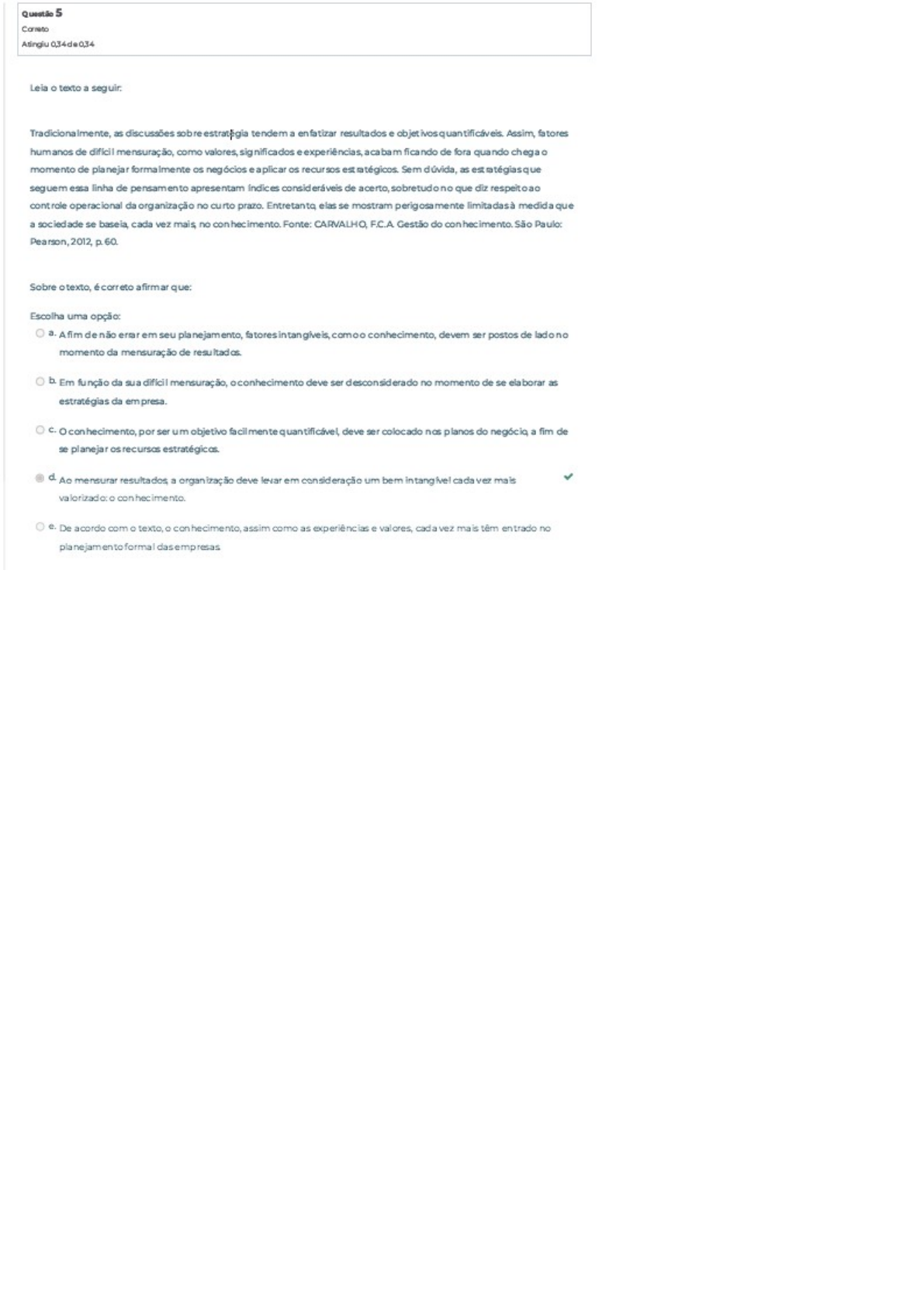 Questão 5 Correto Leia o texto a Tradicionalmente, as discussões sobre tendem a enfatizar resultados e objetivos Assim, fatores humanos de dificil mensuração, como valores, significados e experiências, acabam ficando de fora quando chega o momento de planejar formalmente os negócios e aplicar os recursos est ratégicos. Sem dúvida, as estratégiasque seguem essa linha de pensamento apresentam consideráveis de acerto, sobretudono que diz respeitoao controle operacional da organização no curto prazo. elas se mostram perigosamente limitadasà medida que a sociedade se cada vez no conhecimento. Fonte: CARVALHO, F.C.A. Gestão do São Paulo: Pearson, 2012, p.60. Sobre otexto, écorreto afirmar que: Escolha uma opção: a. A fim de não emseu planejamento, comoo conhecimento, devem ser postos de ladono momento da mensuração de resultados. b. Em função da sua dificil mensuração, o conhecimento deve ser desconsiderado no momento de se elaborar as estratégias da empresa. c. o conhecimento, por ser um objetivo facilmente quantificável, deve ser colocado nos planos do a fim de se planejar estratégicos. d. Ao mensurar resultados a organização deve levar em consideração um bem cada vez mais con e. De acordo com o texto, o con hecimento, assim como as e valores, cad vez mais têm entrado no planejamento formal dasempresas