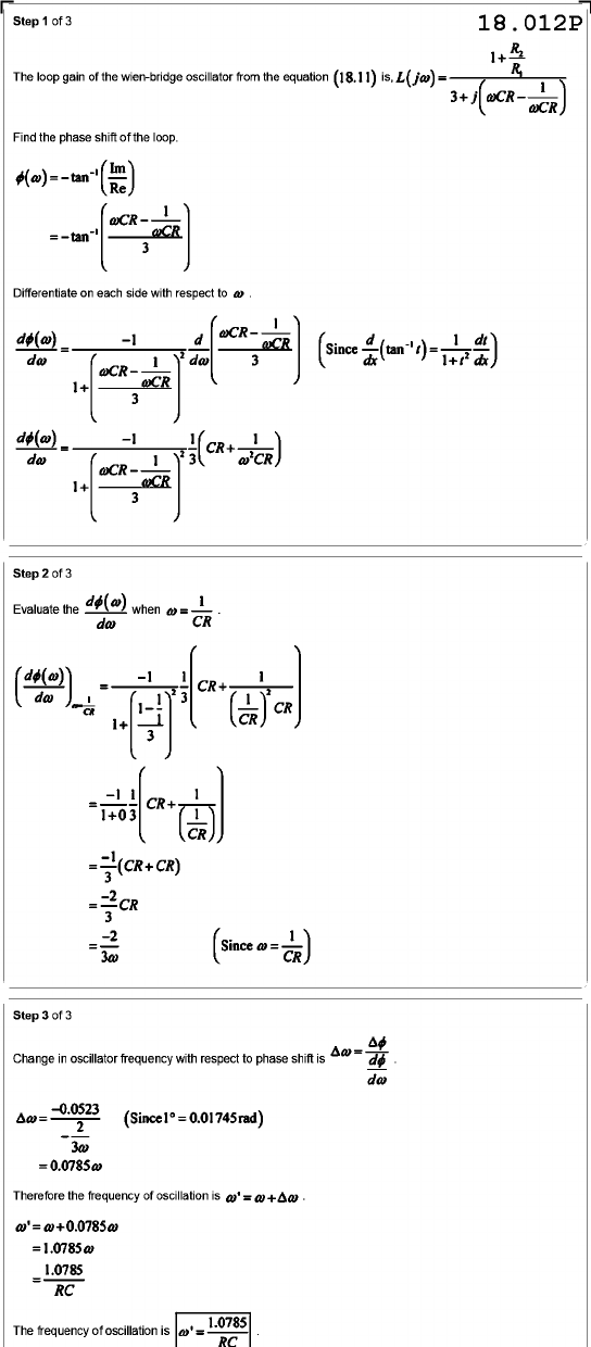Step 1 of 3 18.012P The loop gain of the wien-bridge oscillator from the equation (18.11) is, = Find the phase shift of the loop. Differentiate on to 2 of 3 each side with respect Step Evaluate the when Since Step 3 of 3 Change in oscillator frequency with respect to phase shift is Therefore the frequency of oscillation is 1.0785 RC The frequency of oscillation is à