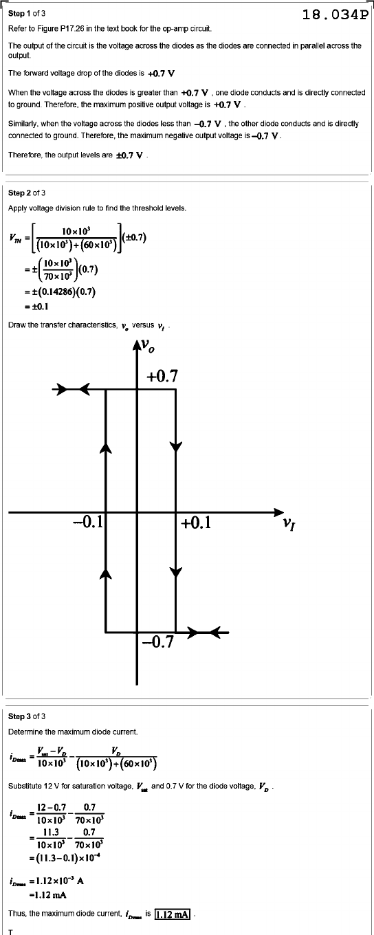 Step 1 of 3 18.034P Refer to Figure P17.26 in the text book for the op-amp circuit. The output of the circuit is the voltage across the diodes as the diodes are connected in parallel across the output. The forward voltage drop of the diodes is +0.7 V When the voltage across the diodes is greater than +0.7 V one diode conducts and is directly connected to ground. Therefore, the maximum positive output voltage is +0.7 V Similarly, when the voltage across the diodes less than -0.7 V the other diode conducts and is directly connected to ground. Therefore, the maximum negative output voltage is -0.7 V. Therefore, the output levels are V Step 2 of 3 Apply voltage division rule to find the threshold levels. = = Draw the transfer characteristics, versus +0.7 -0.1 +0.1 -0.7 Step 3 of 3 Determine the maximum diode current. Substitute 12 V for saturation voltage, and 0.7 V for the diode voltage, 12-0.7 0.7 11.3 = =1.12mA Thus, the maximum diode current, is T