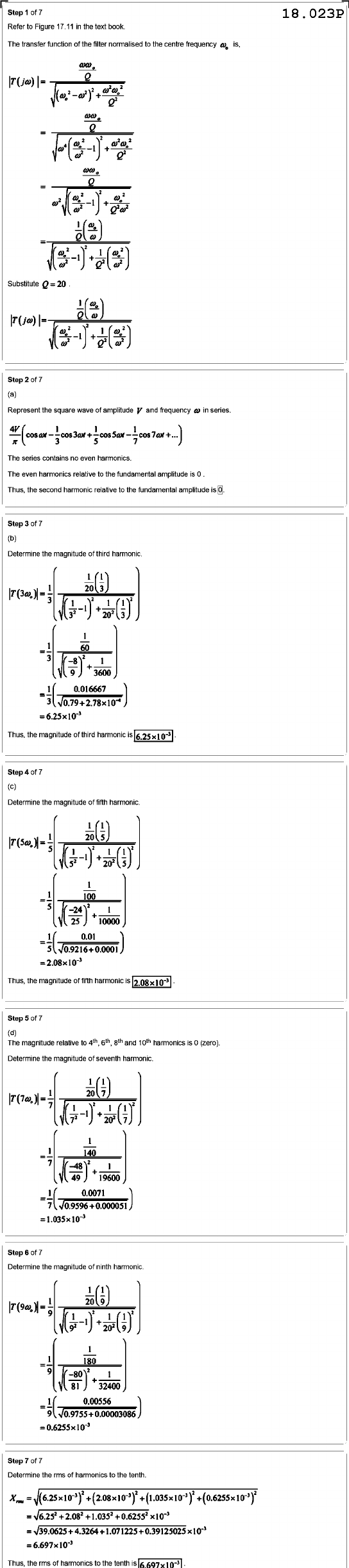 Step of 7 18.023P Refer to Figure 17 11 in the text book The transfer function of the filter normalised to the centre frequency is, = ww = Substitute Q=20 20 - T(ja) 2 Step 7 (a) Represent the square wave of amplitude V and frequency in series. The series contains no even The even harmonics relative to the fundamental amplitude is 0 Thus, the second harmonic relative to the fundamental amplitude Step (b) Determine the magnitude of third harmonic 1 20 3 3 1 1 60 = 3 9 3600 1 0.016667 = 3 ) =6.25x10⁻³ Thus, the magnitude of third harmonic is Step (c) Determine the magnitude of fifth 1 20 5 5 1 1 100 = 5 1 25 10000 1 0.01 = 5 =2.08x10⁻³ Thus, the magnitude of fifth harmonic is Step (d) The magnitude relative to 8th and 10th harmonics is (zero). Determine the magnitude of seventh 1 1 20 7 7 1 140 7 19600 0.0071 7 ) Step of 7 Determine the magnitude of ninth harmonic 1 1 20 9 9 1 20 9 1 180 = 9 -80 1 81 32400 1 0.00556 = 9 ) Step Determine the rms of harmonics to the = = /39.0625+4.3264+1.071225+0.39125025x10 Thus, the rms of harmonics to the tenth is