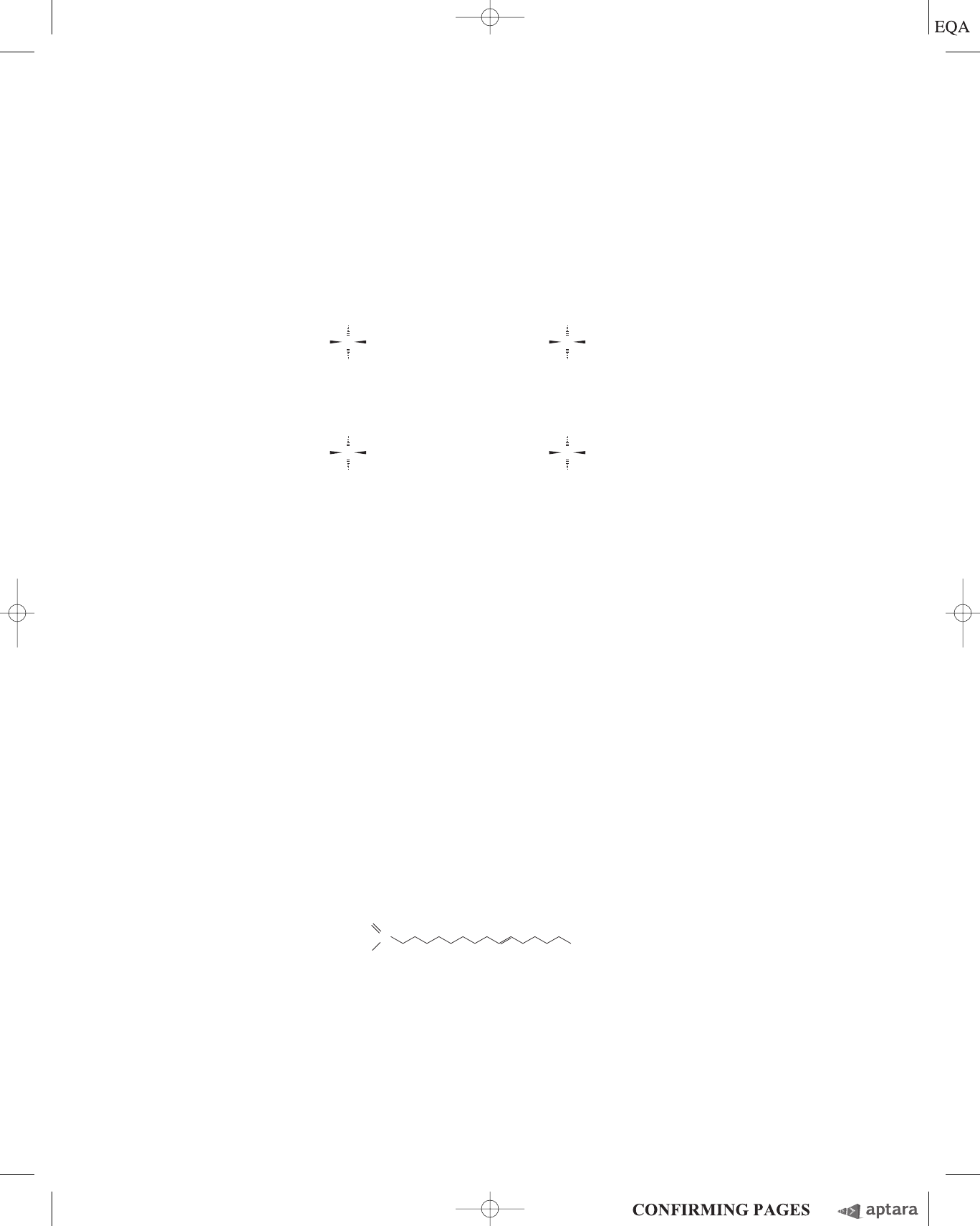 S-114 Chapter 10 Lipids 6. RS Designations for Alanine and Lactate Draw (using wedge-bond notation) and label the (R) and (S) isomers of 2-aminopropanoic acid (alanine) and 2-hydroxypropanoic acid (lactic acid). Answer 2-Aminopropanoic acid (alanine) E E E C H2N CH3 H COOH A 2-Hydroxypropanoic acid (lactic acid) E E E C HO CH3 H COOH A (R)-2-Aminopropanoic acid COOH CH CH3 � NH3 (S)-2-Aminopropanoic acid COOH C CH3 H � H3N (R)-2-Hydroxypropanoic acid (S)-2-Hydroxypropanoic acid COOH C H OHH3C OH C H COOHH3C 7. Hydrophobic and Hydrophilic Components of Membrane Lipids A common structural feature of membrane lipids is their amphipathic nature. For example, in phosphatidylcholine, the two fatty acid chains are hydrophobic and the phosphocholine head group is hydrophilic. For each of the following membrane lipids, name the components that serve as the hydrophobic and hydrophilic units: (a) phos- phatidylethanolamine; (b) sphingomyelin; (c) galactosylcerebroside; (d) ganglioside; (e) cholesterol. Answer Hydrophobic unit(s) Hydrophilic unit(s) (a) 2 Fatty acids Phosphoethanolamine (b) 1 Fatty acid and the hydrocarbon Phosphocholine chain of sphingosine (c) 1 Fatty acid and the hydrocarbon D-Galactose chain of sphingosine (d) 1 Fatty acid and the hydrocarbon Several sugar molecules chain of sphingosine (e) Steroid nucleus and acyl side chain Alcohol group 8. Structure of Omega-6 Fatty Acid Draw the structure of the omega-6 fatty acid 16:1. Answer 9. Catalytic Hydrogenation of Vegetable Oils Catalytic hydrogenation, used in the food industry, con- verts double bonds in the fatty acids of the oil triacylglycerols to OCH2OCH2O. How does this affect the physical properties of the oils? Answer It reduces double bonds, which increases the melting point of lipids containing the fatty acids. 10. Alkali Lability of Triacylglycerols A common procedure for cleaning the grease trap in a sink is to add a product that contains sodium hydroxide. Explain why this works. O �O C 2608T_ch10sm_S112-S119 02/21/2008 9:50 pm Page S-114 pinnacle OSX:Desktop Folder:TEMPWORK:FEBRUARY:21-02-08:WHQY028/soln: