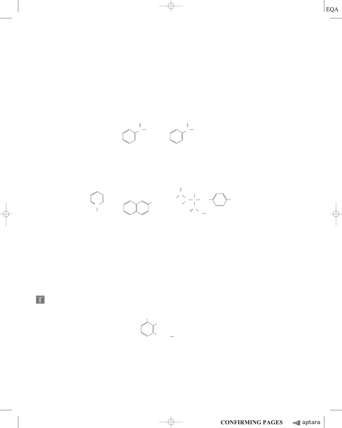 S-16 Chapter 2 Water (c) log (5/1) � 0.70; pH � 4.76 � 0.70 � 5.46 (d) log (1/1) � 0; pH � 4.76 (e) log (1/10) � �1.00; pH � 4.76 � (�1.00) � 3.76 12. Effect of pH on Solubility The strongly polar hydrogen-bonding properties of water make it an excellent solvent for ionic (charged) species. By contrast, nonionized, nonpolar organic molecules, such as benzene, are relatively insoluble in water. In principle, the aqueous solubility of an organic acid or base can be increased by converting the molecules to charged species. For example, the solubility of benzoic acid in water is low. The addition of sodium bicarbonate to a mixture of water and benzoic acid raises the pH and deprotonates the benzoic acid to form benzoate ion, which is quite soluble in water. Are the following compounds more soluble in an aqueous solution of 0.1 M NaOH or 0.1 M HCl? (The dis- sociable proton in (c) is that of the OOH group.) Answer (a) Pyridine is ionic in its protonated form and therefore more soluble at the lower pH, in 0.1 M HCl. (b) b-Naphthol is ionic when deprotonated and thus more soluble at the higher pH, in 0.1 M NaOH. (c) N-Acetyltyrosine methyl ester is ionic when deprotonated and thus more soluble in 0.1 M NaOH. 13. Treatment of Poison Ivy Rash The components of poison ivy and poison oak that produce the characteristic itchy rash are catechols substituted with long-chain alkyl groups. If you were exposed to poison ivy, which of the treatments below would you apply to the affected area? Justify your choice. (a) Wash the area with cold water. (b) Wash the area with dilute vinegar or lemon juice. C O OH C O� Benzoic acid Benzoate ion pKa ≈ 5 O N� H Pyridine ion pKa ≈ 5 (b) (c)(a) -Naphthol� pKa ≈ 10 C H N H C H C O O CH3 CH2 N-Acetyltyrosine methyl ester pKa ≈ 10 CH3 OH O O OH (CH2)n CH3 pKa ≈ 8 OH 2608T_ch02sm_S13-S25 2/1/08 5:57PM Page S-16 ntt 102:WHQY028:Solutions Manual:Ch-02: