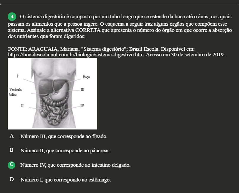 4 o sistema digestório é composto por um tubo longo que se estende da boca até ânus, nos quais passam os alimentos que a pessoa ingere. o esquema a seguir traz alguns órgãos que compõem esse sistema. Assinale a alternativa CORRETA que apresenta número do órgão em que ocorre a absorção dos nutrientes que foram digeridos: FONTE: ARAGUAIA, Mariana. "Sistema digestório"; Brasil Escola. Disponível em: https://brasilescola.uol.com.br/biologia/sistema-digestivo.htm. Acesso em 30 de setembro de 2019. I Baço III biliar II IV A Número III, que corresponde ao figado. B Número II, que corresponde ao pâncreas. Número IV, que corresponde ao intestino delgado. D Número I, que corresponde ao estômago.