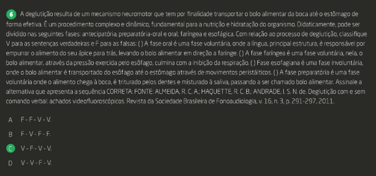 6 A deglutição resulta de um mecanismo neuromotor que tem por finalidade transpor tar 0 bolo alimentar da boca até 0 estômago de forma É um procedimento complexo e dinâmico, fundamental para a nutrição e hidratação do organismo. Didaticamente, pode ser dividido nas seguintes antecipatória, preparatória-oral e oral; e esofágica. Com relação ao processo de deglutição, classifique V para as sentenças verdadeiras eF para as falsas: () A fase oral é uma fase voluntária, onde a principal estrutura, é responsável por empurrar alimento do seu apice para trás, levando bolo alimentar em direção a faringe. A fase faringea é uma fase voluntária, nela, bolo alimentar, através da pressão exercida pelo esôfago, culmina com a inibição da respiração. Fase esofagiana é uma fase involuntária, onde bolo alimentar é transportado do até 0 estômago através de movimentos peristálticos. 0 A fase preparatória é uma fase voluntária onde 0 alimento chega à boca, é triturado pelos dentes e misturado à saliva, passando a ser chamado bolo alimentar. Assinale a alternativa que apresenta a sequência CORRETA: FONTE: ALMEIDA, R. C. HAQUETTE, R. C. S. N. Deglutição com e sem comando verbal: achados videofluoroscópicos. Revista da Sociedade Brasileira de Fonoaudiologia, V. n. 3. 2011. A B D