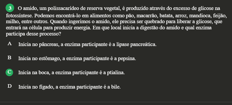 3 o amido, um polissacarídeo de reserva vegetal, é produzido através do excesso de glicose na fotossíntese. Podemos encontrá-lo em alimentos como pão, macarrão, batata, arroz, mandioca, feijão, milho, entre outros. Quando ingerimos amido, ele precisa ser quebrado para liberar a glicose, que entrará na célula para produzir energia. Em que local inicia a digestão do amido e qual enzima participa desse processo? A Inicia no pâncreas, a enzima participante é a lipase B Inicia no estômago, a enzima participante é a pepsina. Inicia na boca, a enzima participante é a ptialina. D Inicia no figado, a enzima participante é a bile.