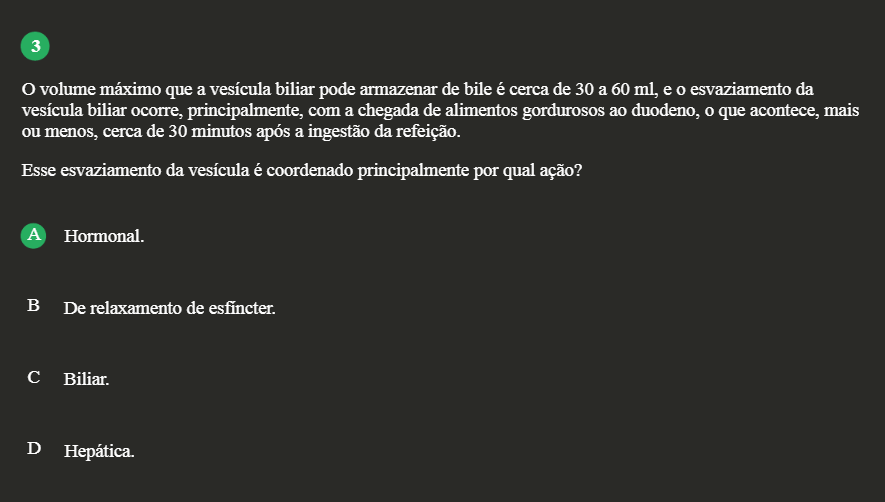 3 o volume máximo que a vesícula biliar pode armazenar de bile é cerca de 30 a 60 ml, e esvaziamento da vesícula biliar ocorre, principalmente, com a chegada de alimentos gordurosos ao duodeno, o que acontece, mais ou menos, cerca de 30 minutos após a ingestão da refeição. Esse esvaziamento da vesícula é coordenado principalmente por qual ação? A Hormonal. B De relaxamento de esfincter. C Biliar. D Hepática.